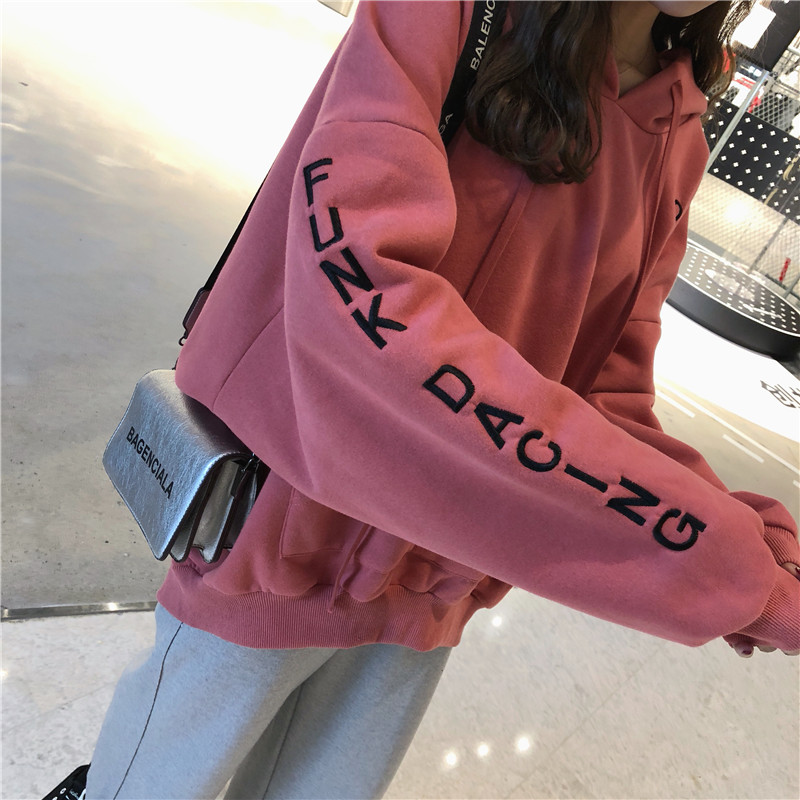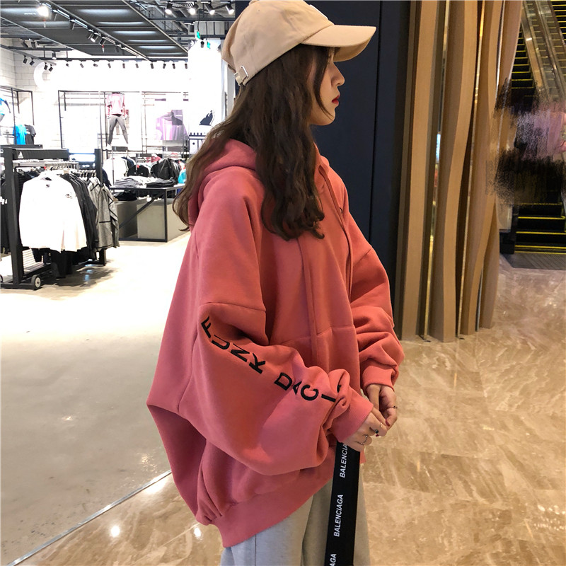 2018新款秋冬韓版中長款刺繡字母寬松連帽加絨加厚超火衛衣外套女