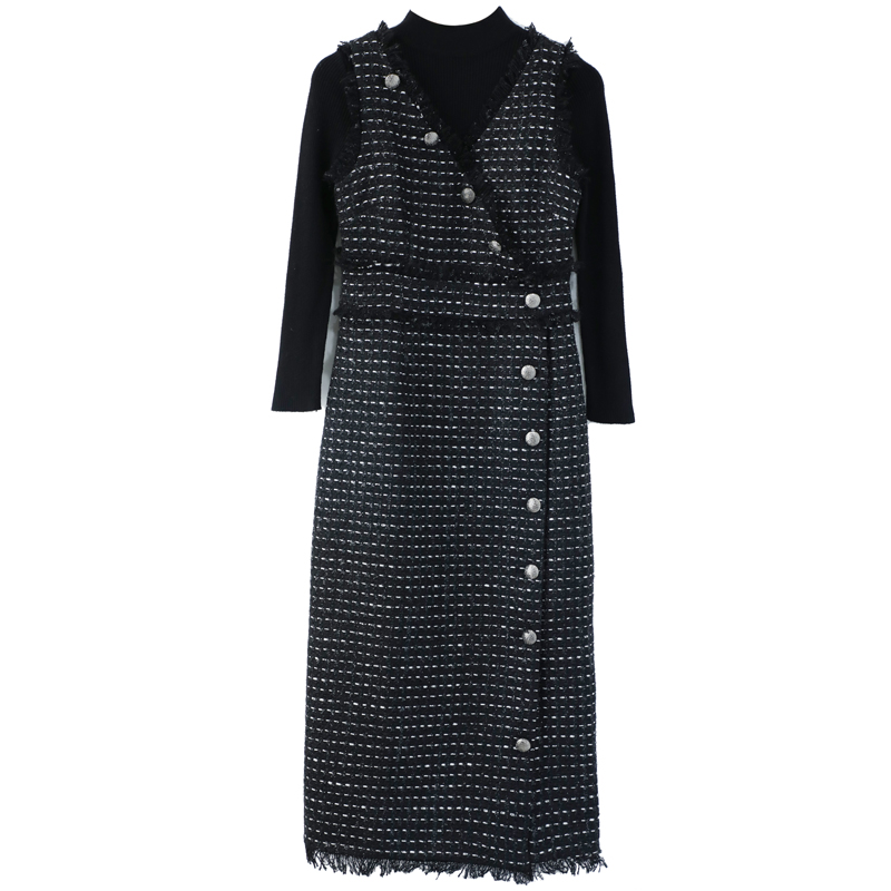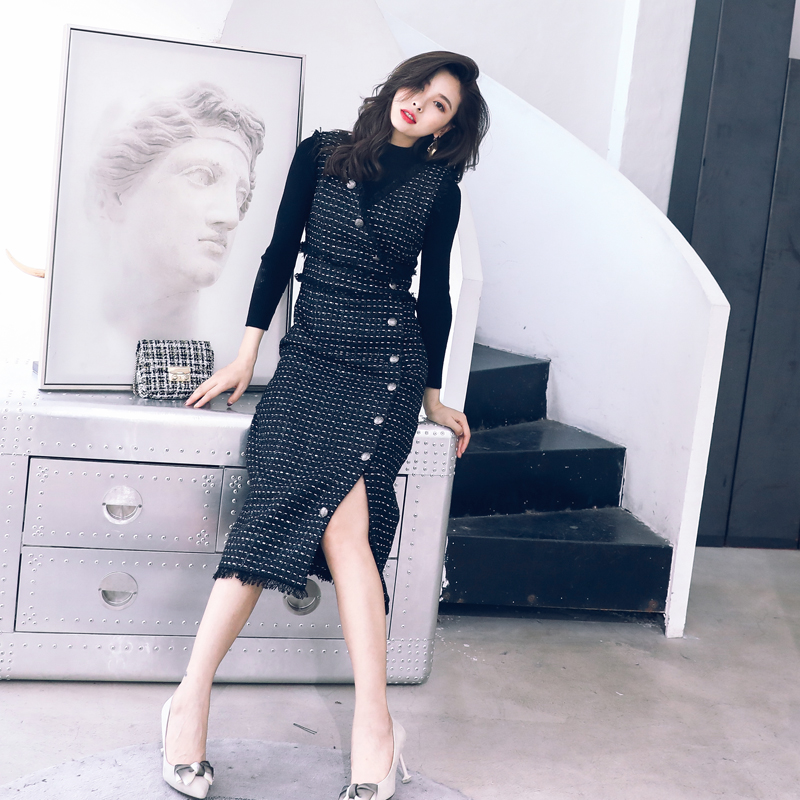 / 網紅時尚毛呢背帶連衣裙秋冬裝女2018新款氣質毛衣裙子兩件套裝