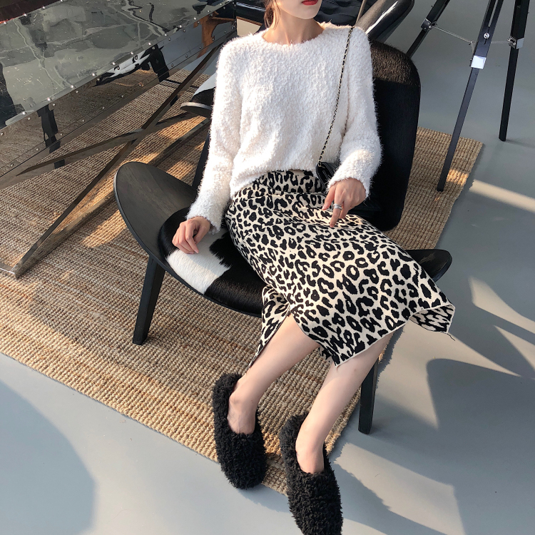 新款純色顯瘦上衣毛絨絨寬松毛衣女針織衫豹紋包臂半身裙時尚套裝