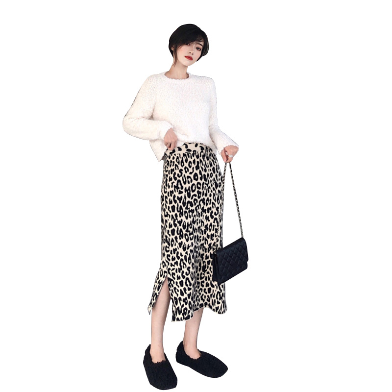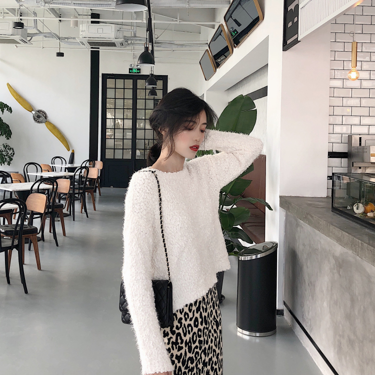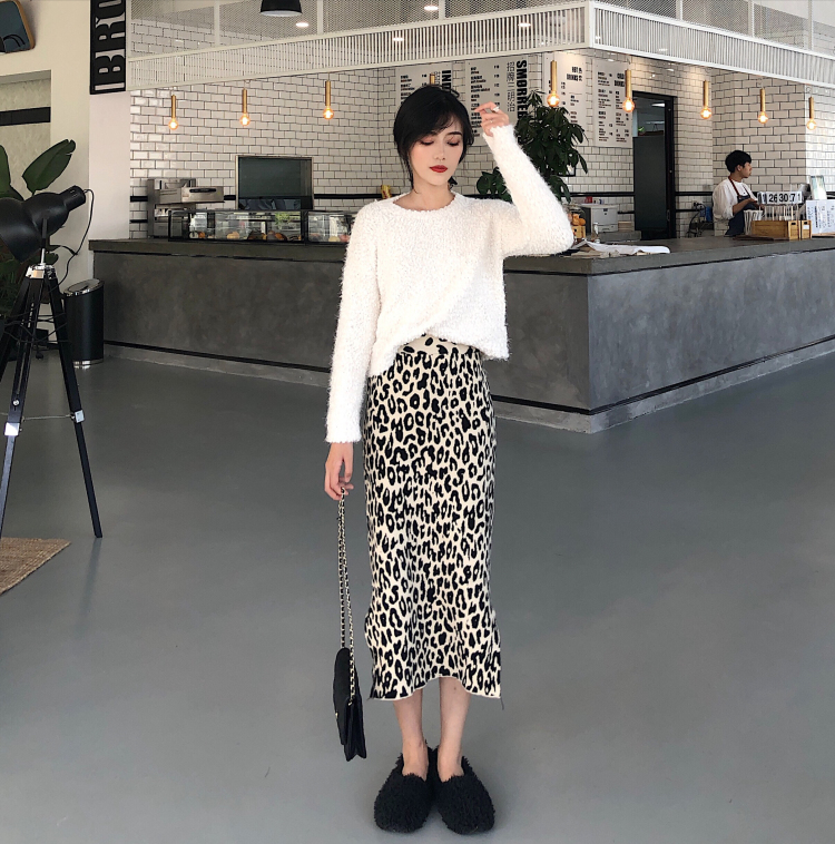 / 新款純色顯瘦上衣毛絨絨寬松毛衣女針織衫豹紋包臂半身裙時尚套裝