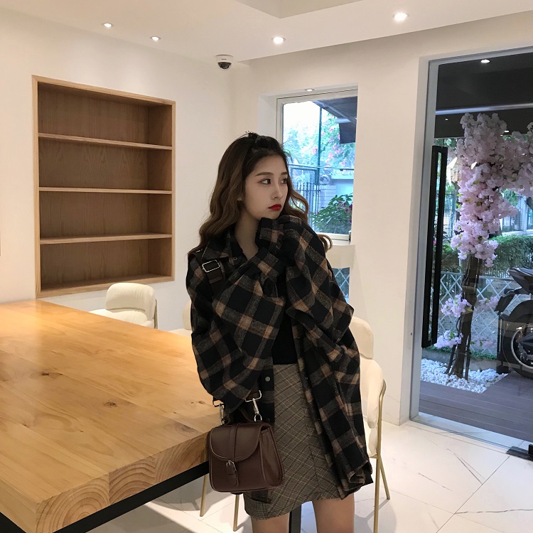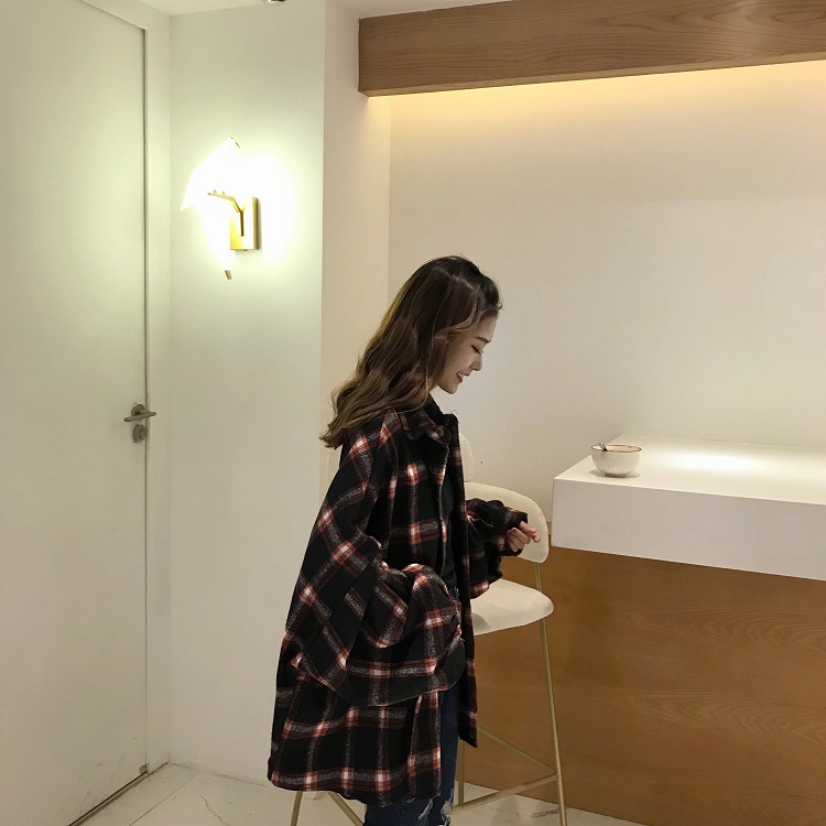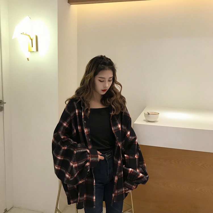 / 秋裝女裝韓版BF風寬松中長款蝙蝠袖襯衫休閑格子長袖襯衣上衣外套