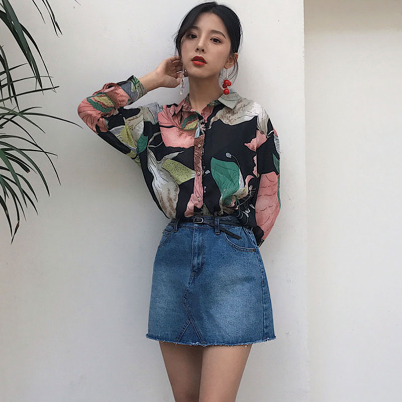 / 早春新款女裝港味復古寬松顯瘦大花氣質翻領學生排扣長袖雪紡襯衫