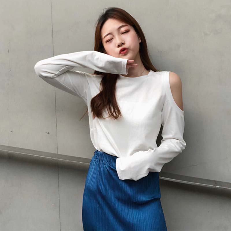 / 秋裝女新款韓版小心機露肩長袖純色T恤港風時尚修身打底圓領上衣