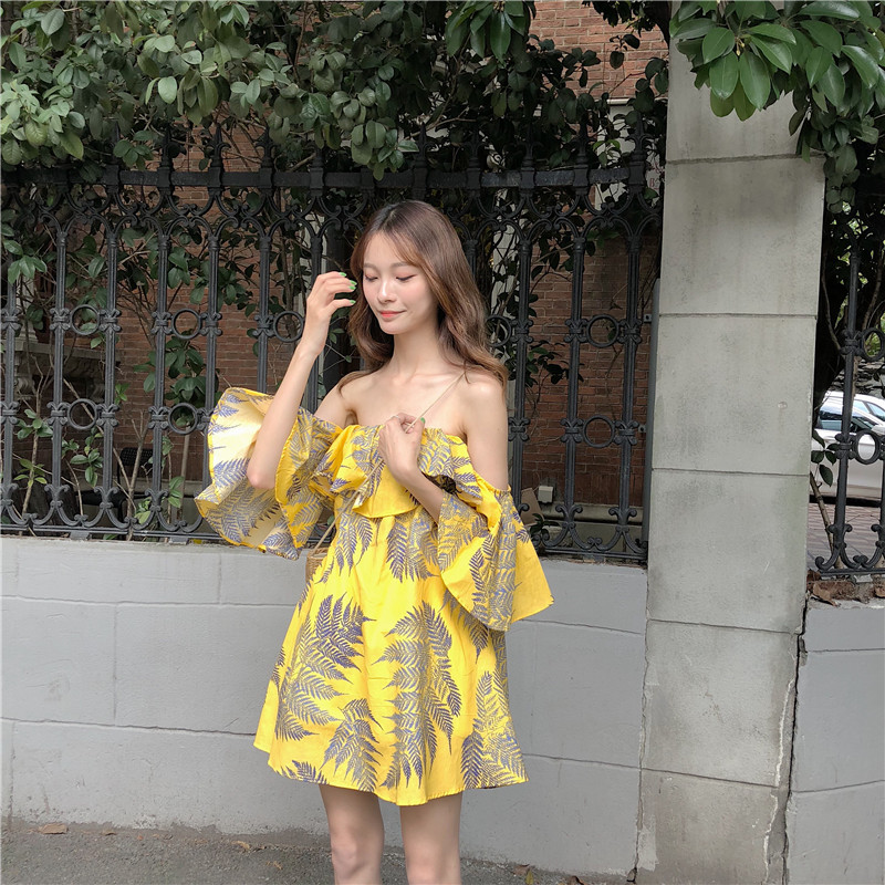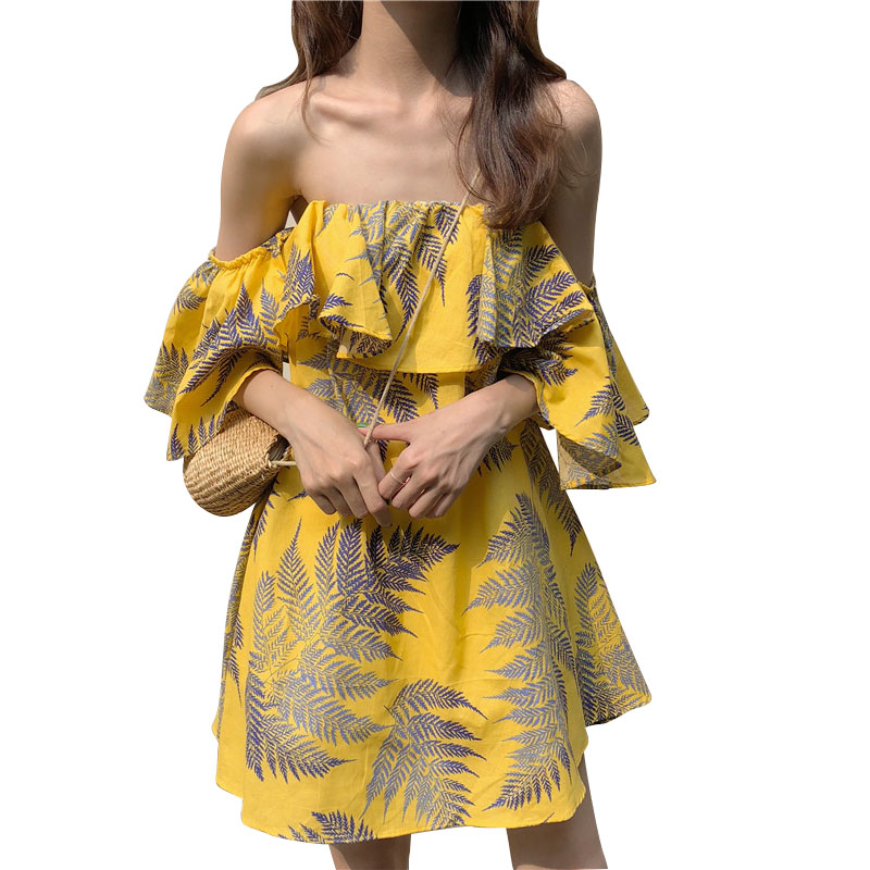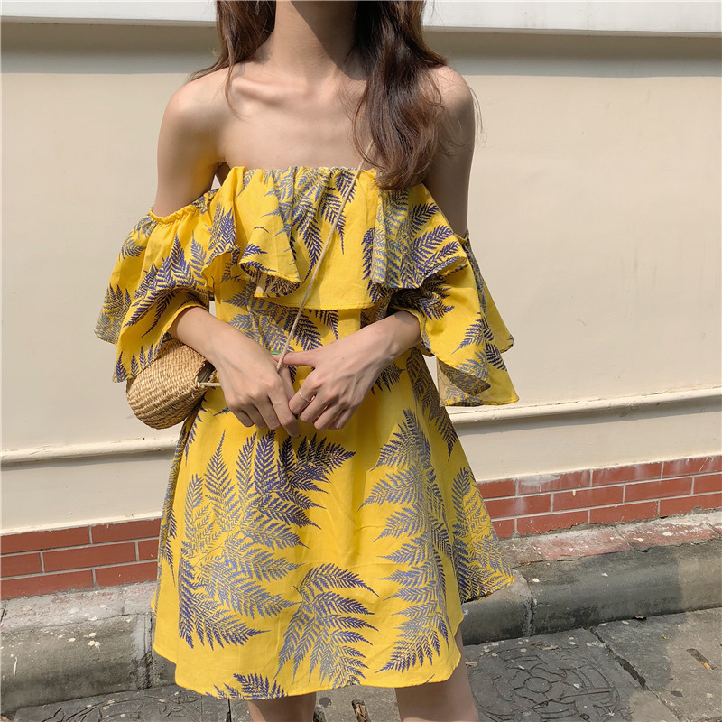 / 夏裝女裝韓版氣質甜美荷葉邊一字肩露肩中長款抹胸顯瘦連衣裙短裙