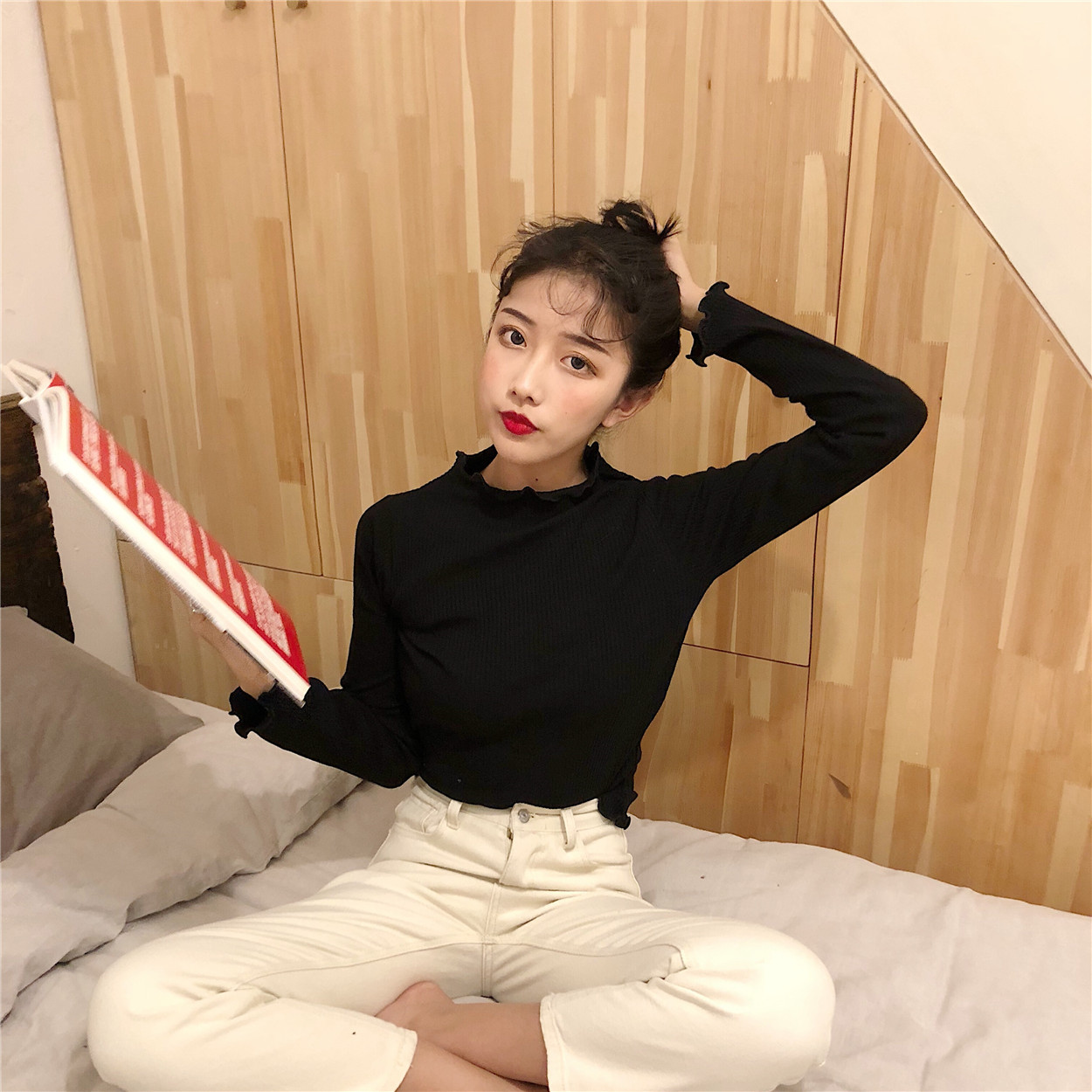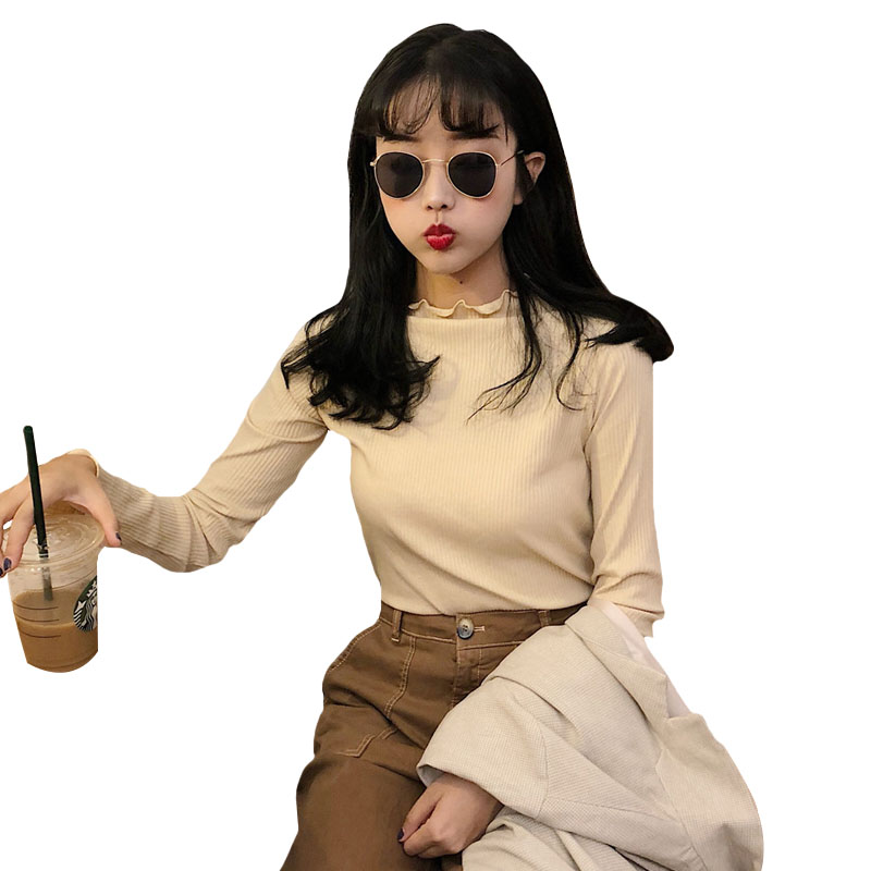 / 秋季女裝韓版糖果色坑條修身顯瘦長袖T恤學生純色卷邊打底衫上衣