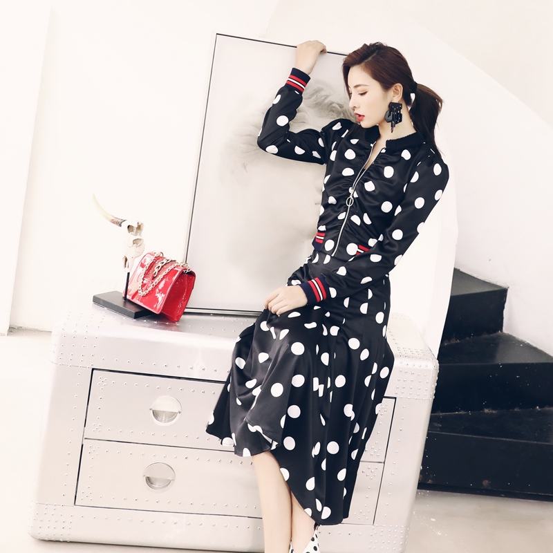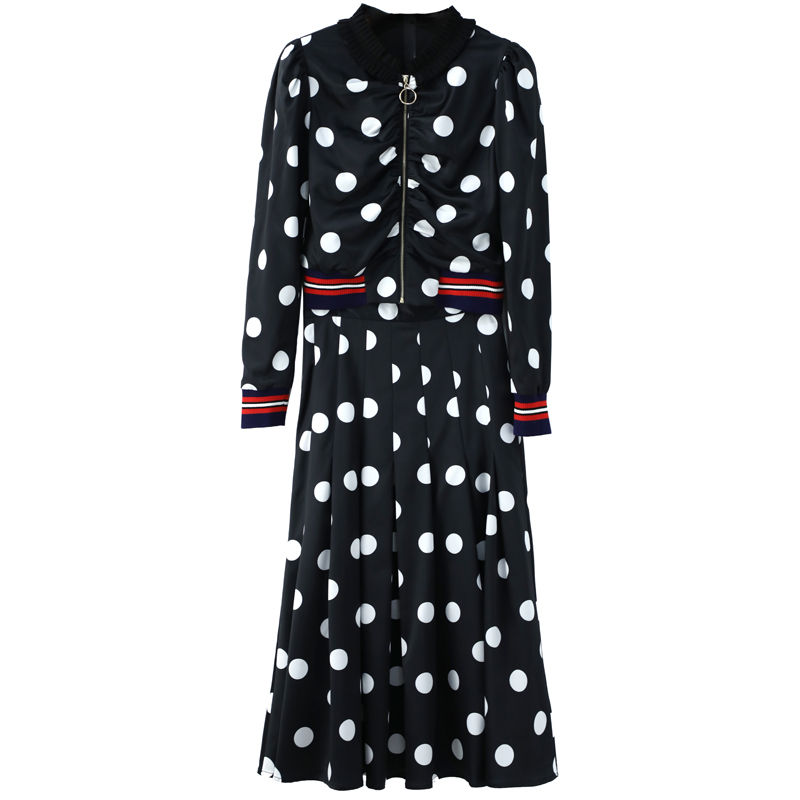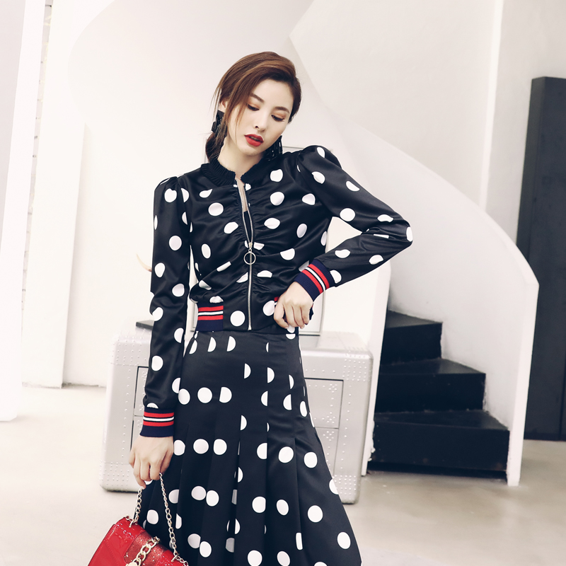 / 歐洲站2018秋裝新款氣質套裝波點休閑長袖上衣中長款半身裙兩件套