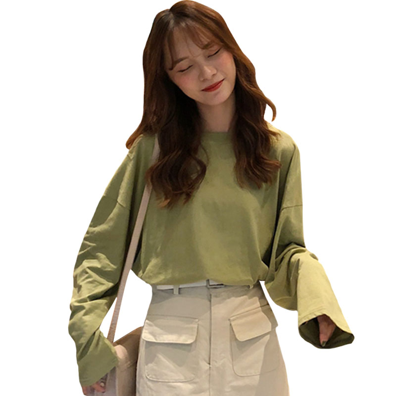 秋裝女裝韓版百搭寬松純色長袖T恤套頭圓領休閑顯瘦學生體恤上衣