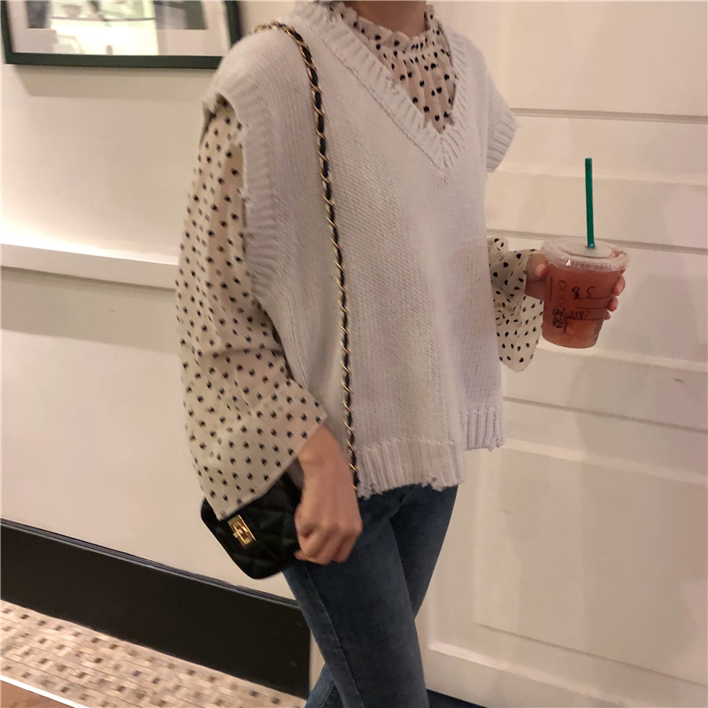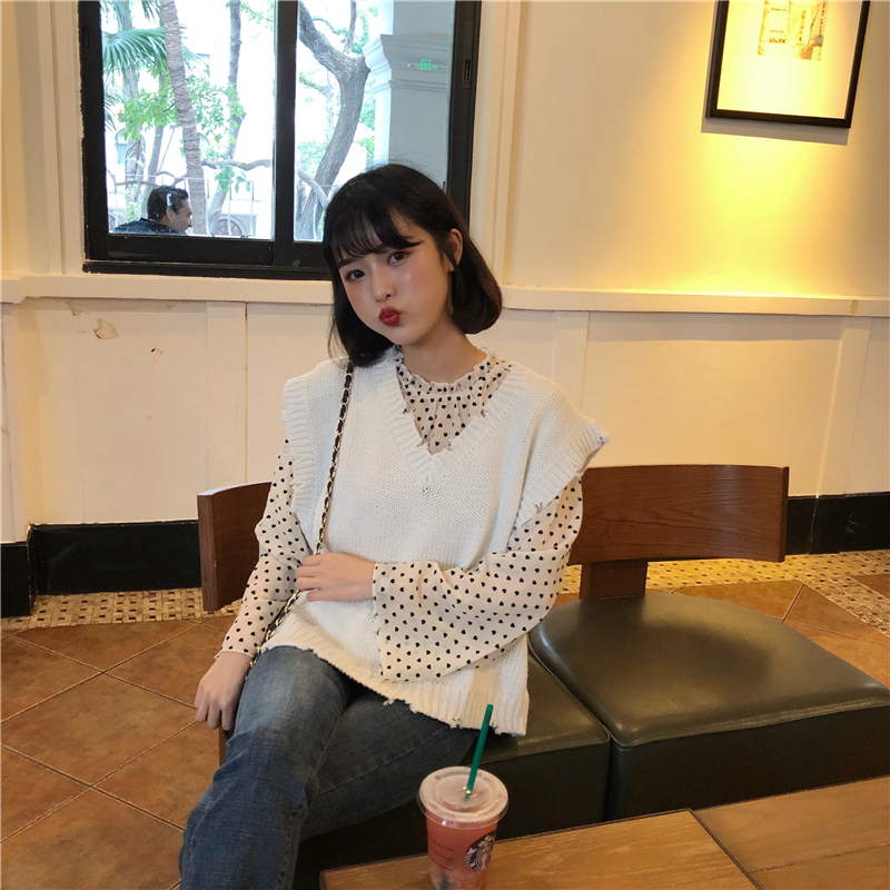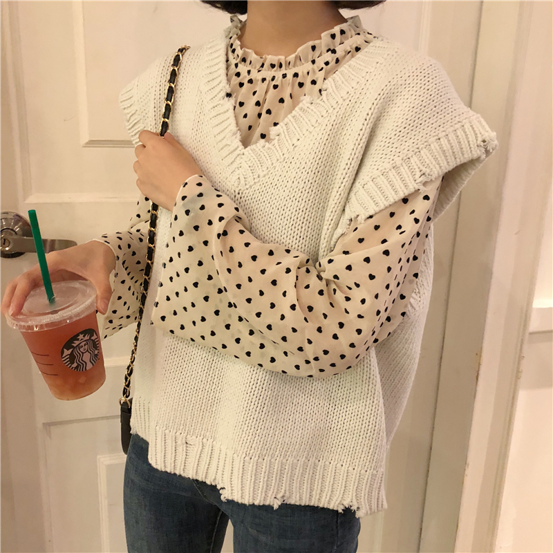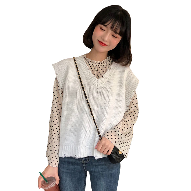 / 韓版時尚休閑套裝秋裝女裝愛心雪紡衫襯衣+V領針織毛衣馬甲兩件套