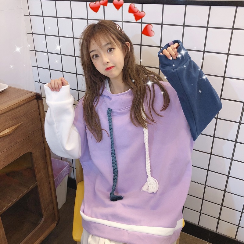 2018新款秋冬女裝韓版寬松學院風撞色獨角獸連帽套頭衛衣上衣外套