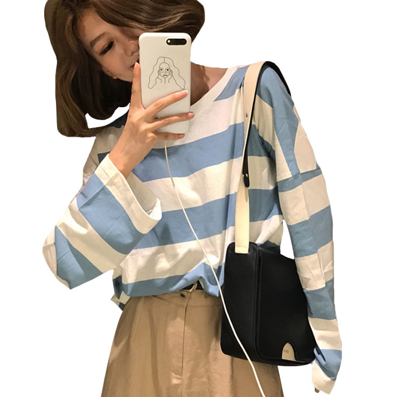 / 秋裝女裝韓版寬松百搭顯瘦拼色條紋T恤學生長袖休閑顯瘦體恤上衣