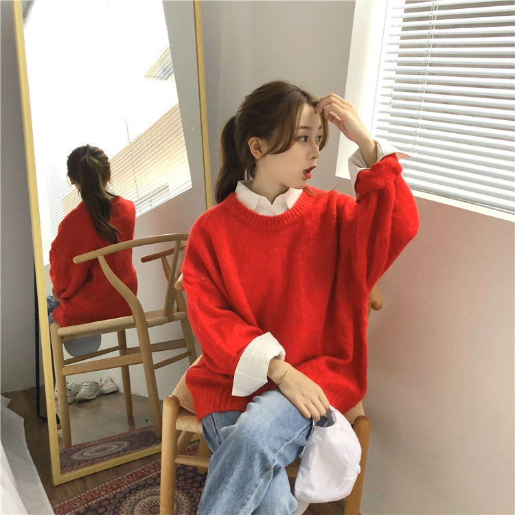 / 秋季韓版慵懶風純色加厚馬海毛網紅寬松套頭毛衣針織衫上衣外套女