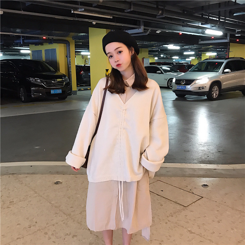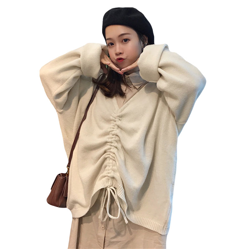 / 秋季韓版中長款慵懶風chic寬松V領網紅套頭針織衫毛衣上衣外套女