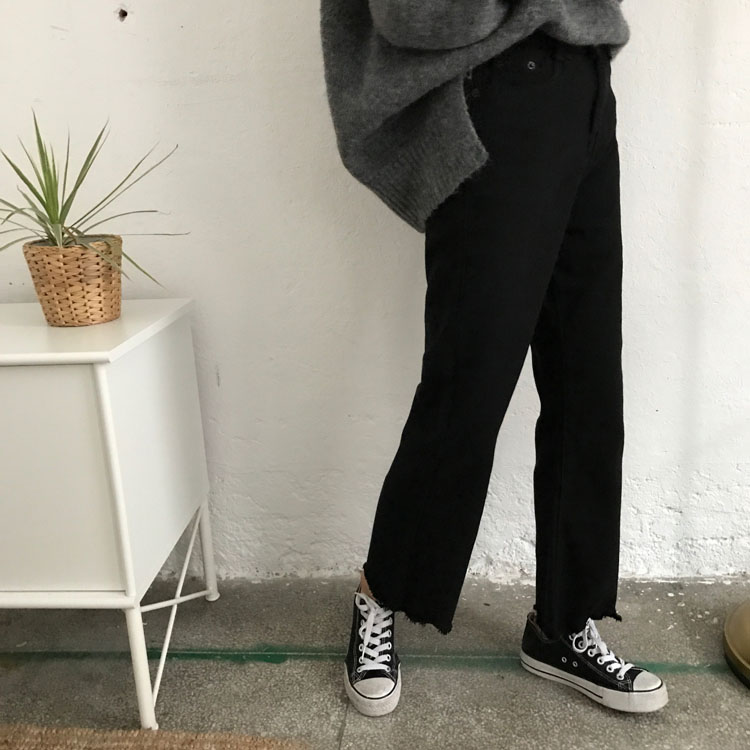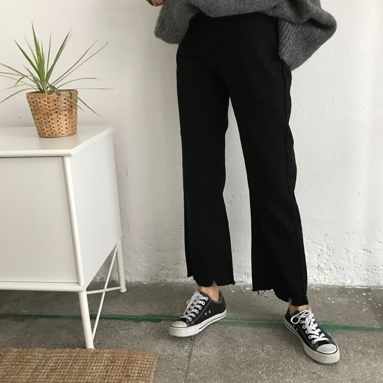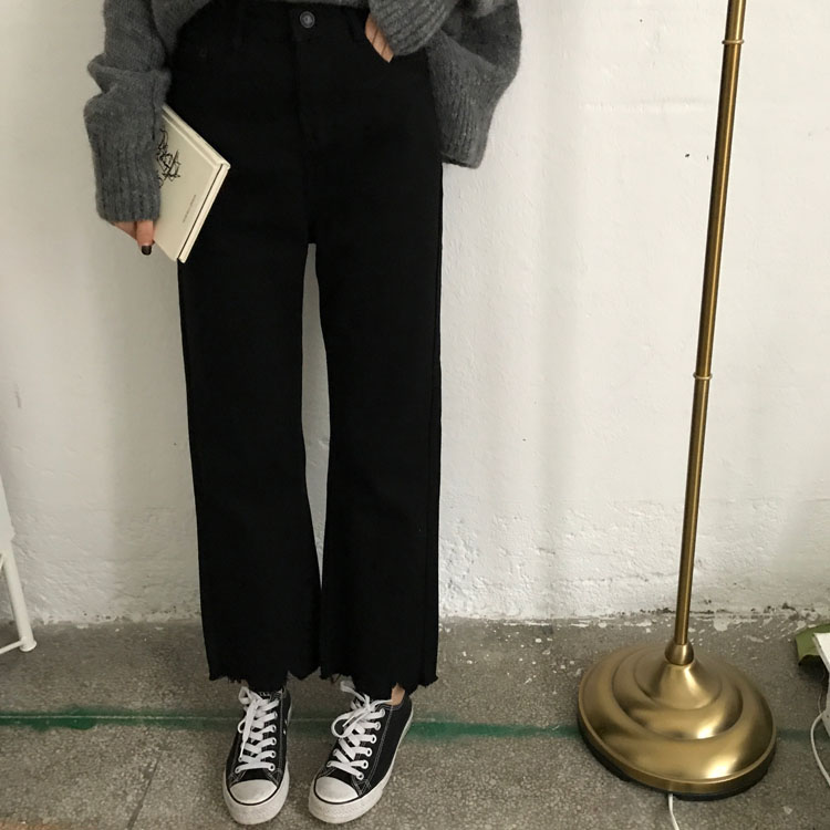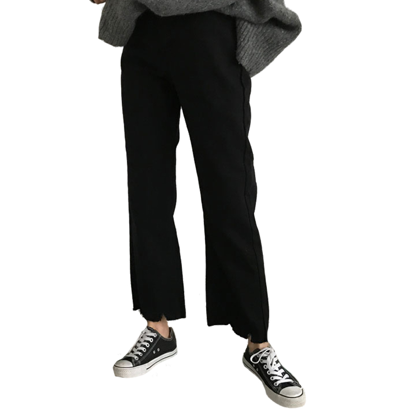 / 秋裝女裝韓版不規則缺口高腰寬松闊腿褲牛仔褲九分褲直筒褲長褲潮
