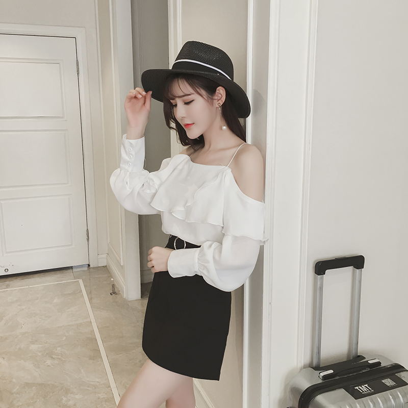 春夏新款女裝韓版一字領露肩荷葉邊吊帶雪紡衫女士燈籠袖露背上衣