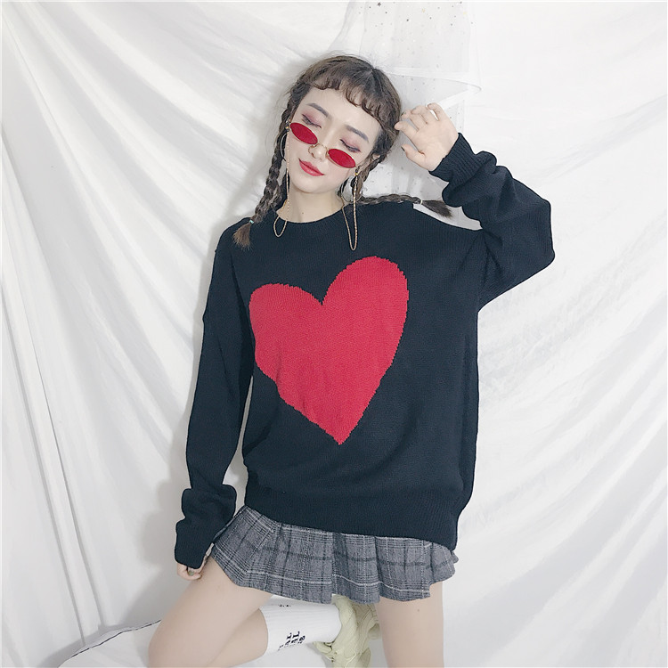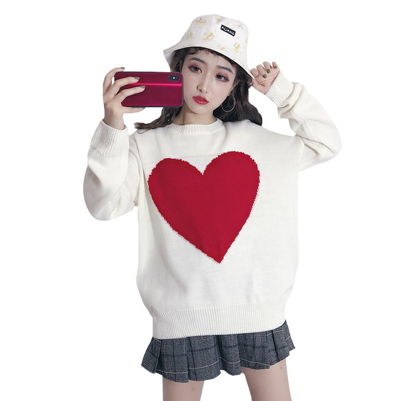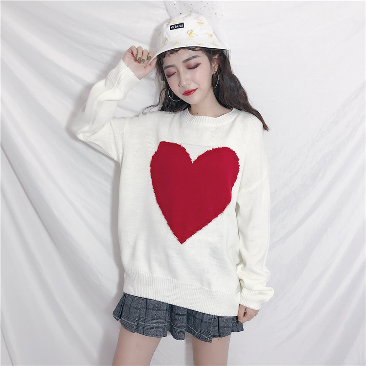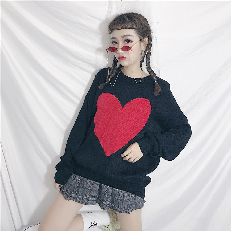 / 秋冬女裝韓版原宿風套頭長袖針織衫寬松百搭愛心提花毛衣上衣外套
