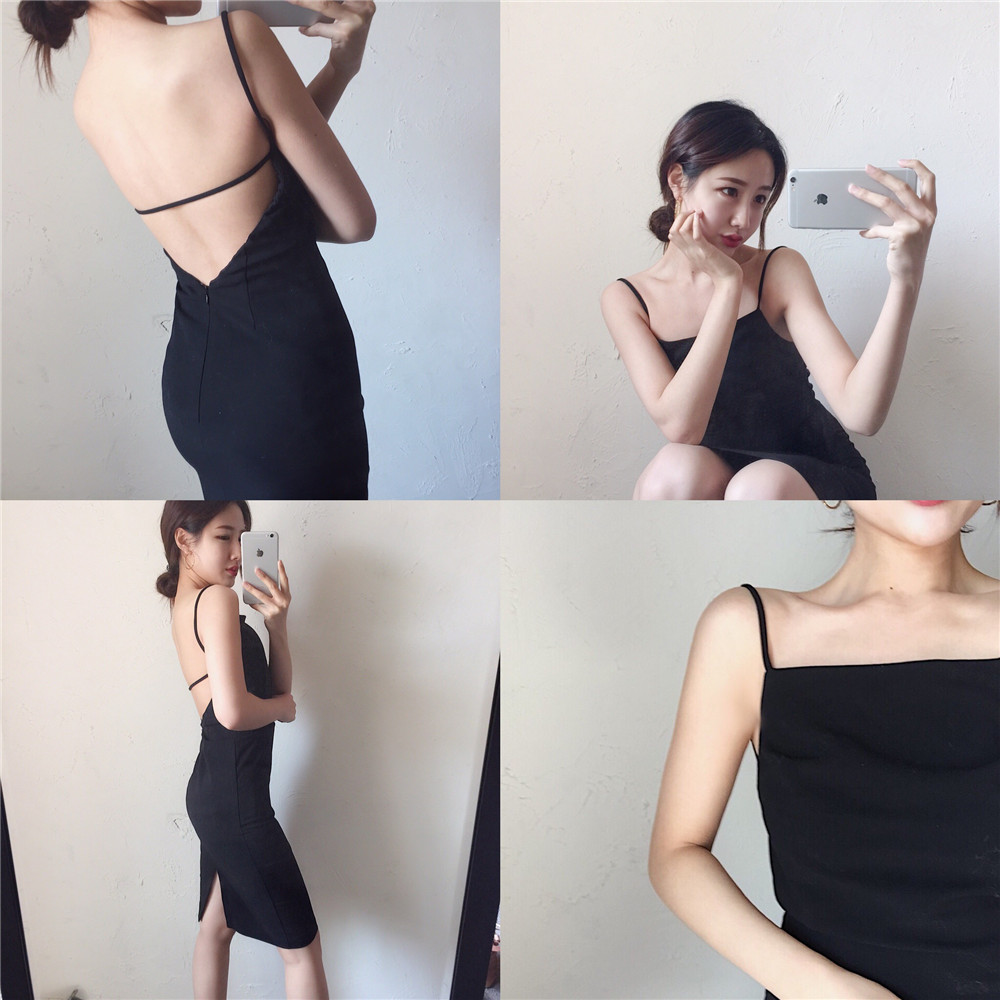 / 港味復古韓國chic風性感露背吊帶連衣裙修身顯瘦氣質純色中長裙女