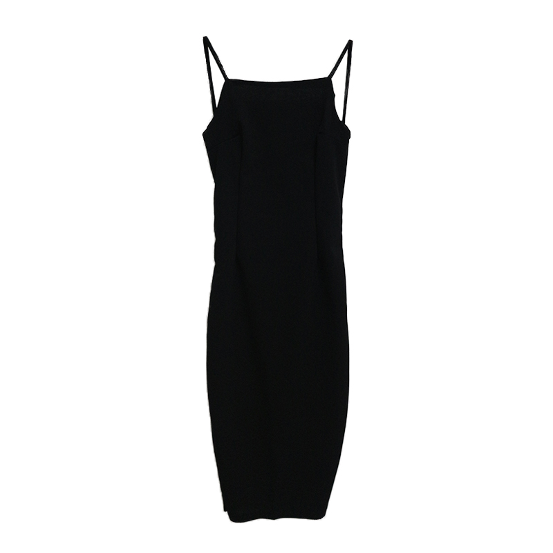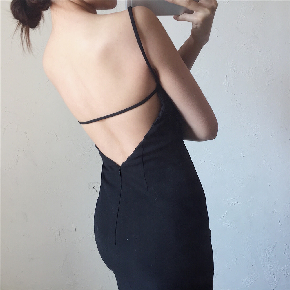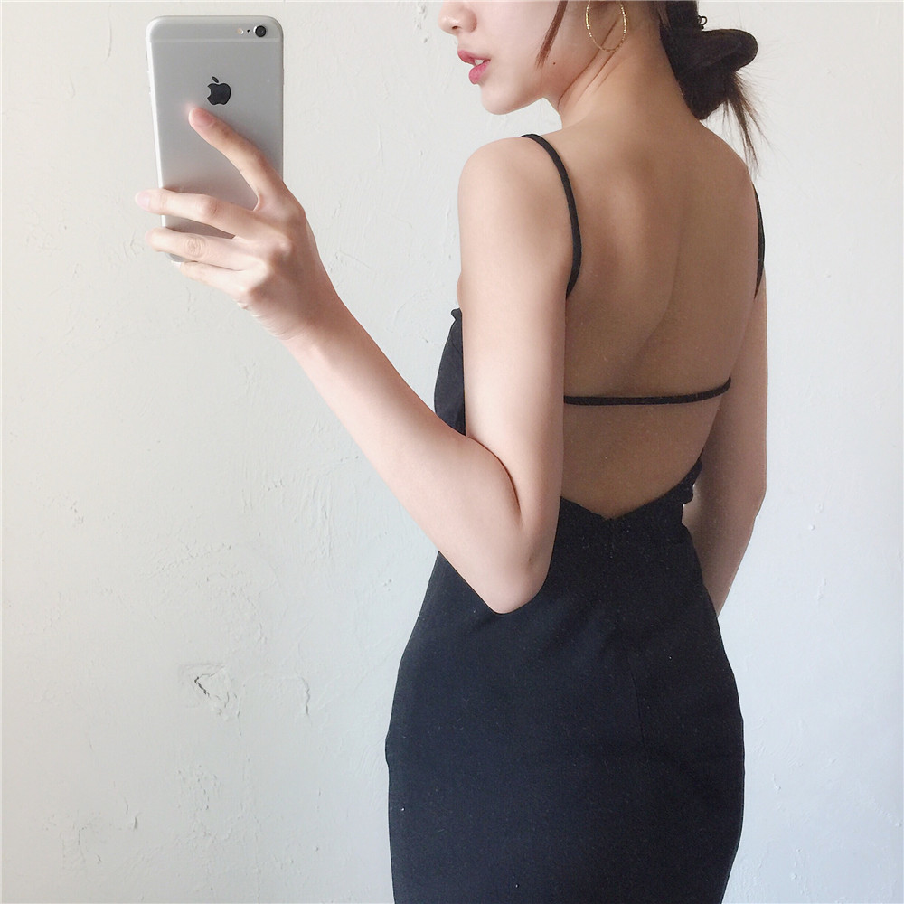 港味復古韓國chic風性感露背吊帶連衣裙修身顯瘦氣質純色中長裙女