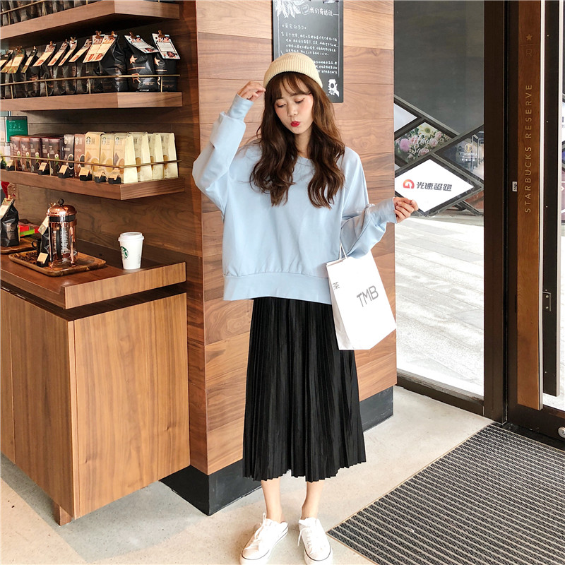 / 韓版時尚休閑套裝秋季女裝開叉衛衣外套+松緊腰壓褶半身裙兩件套