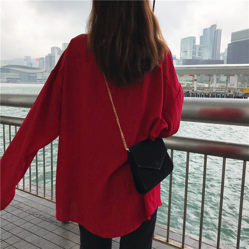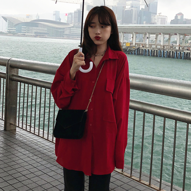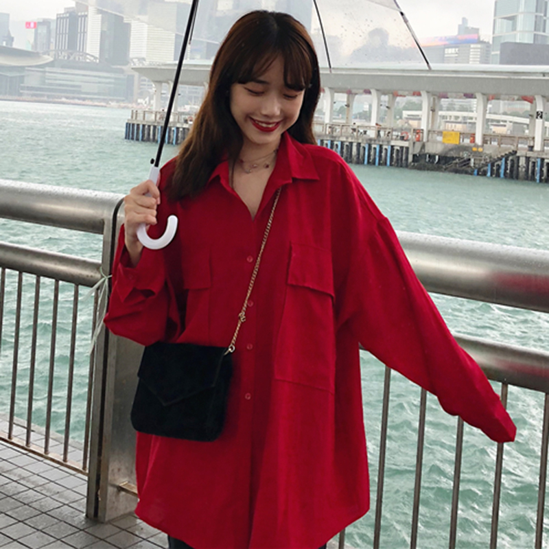 / 休閑上衣女秋季2018新款韓版女裝寬松長袖中長款紅色襯衫學生襯衣