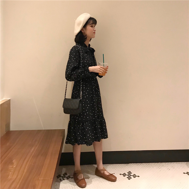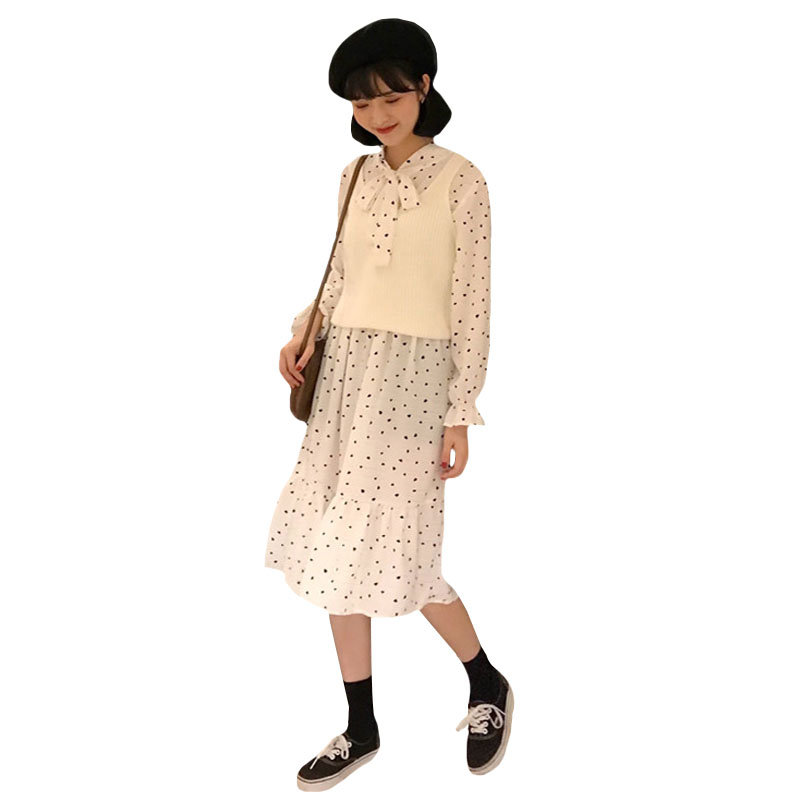 / 韓版時尚休閑套裝秋季針織馬甲+高腰雪紡波點長袖連衣裙兩件套女