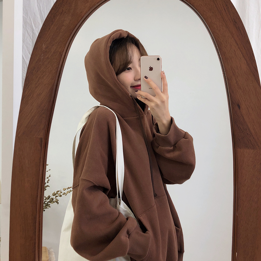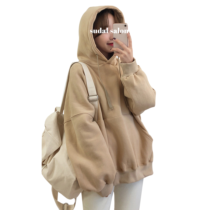 2018新款秋冬韓版慵懶風純色寬松加絨加厚連帽超火衛衣上衣外套女