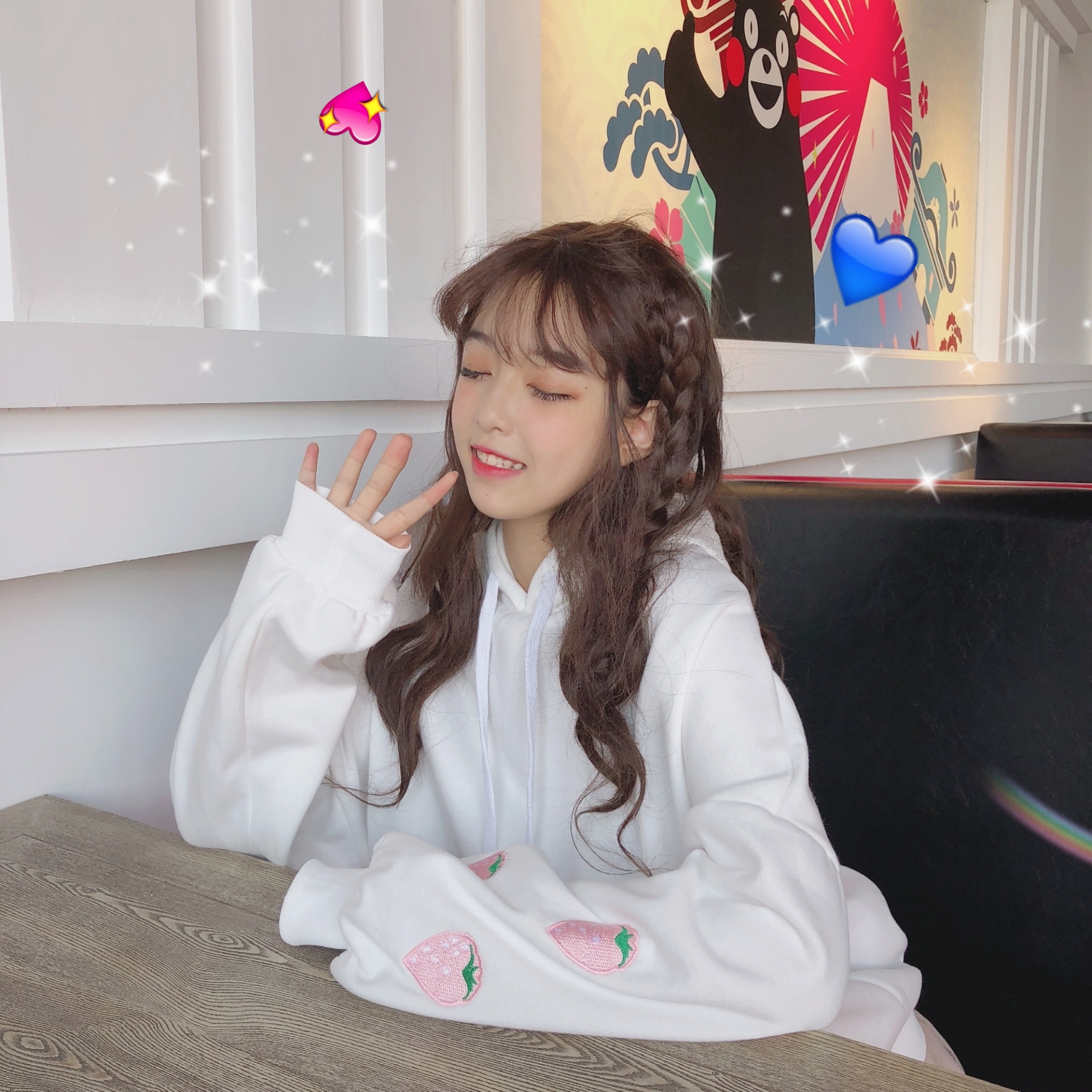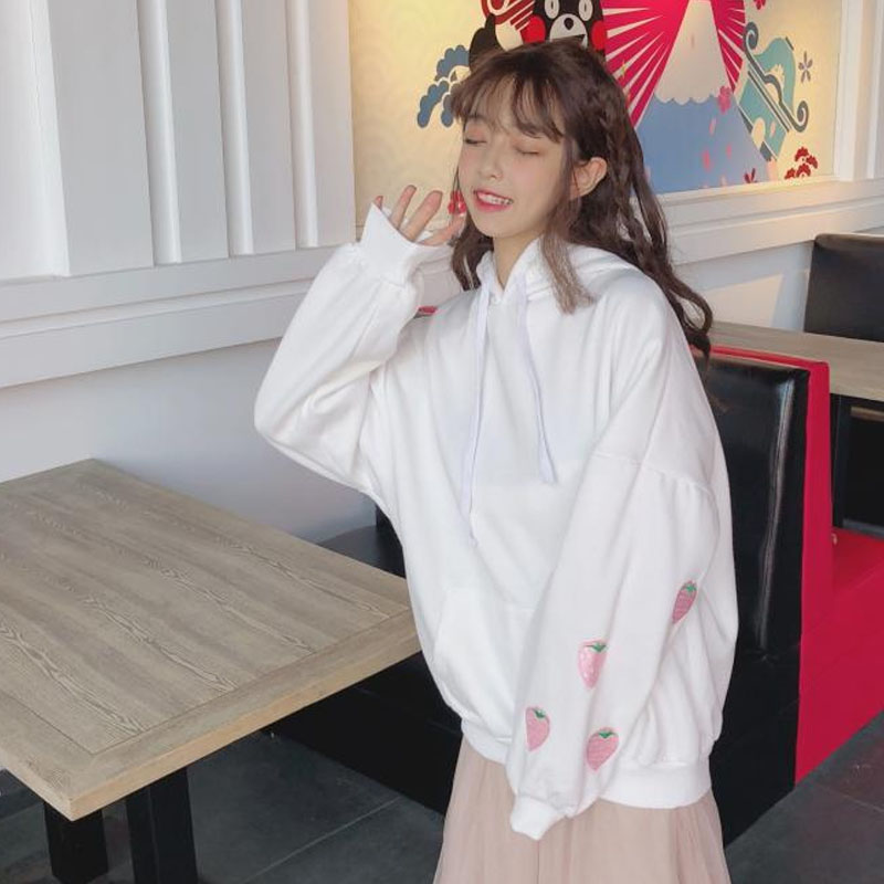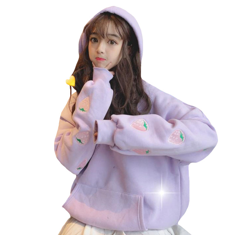 / 秋冬女裝韓版BF風寬松草莓刺繡連帽套頭加絨加厚超火衛衣上衣外套