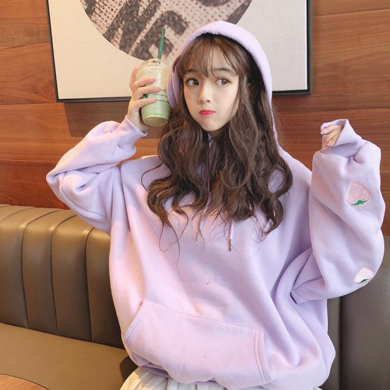 秋冬女裝韓版BF風寬松草莓刺繡連帽套頭加絨加厚超火衛衣上衣外套