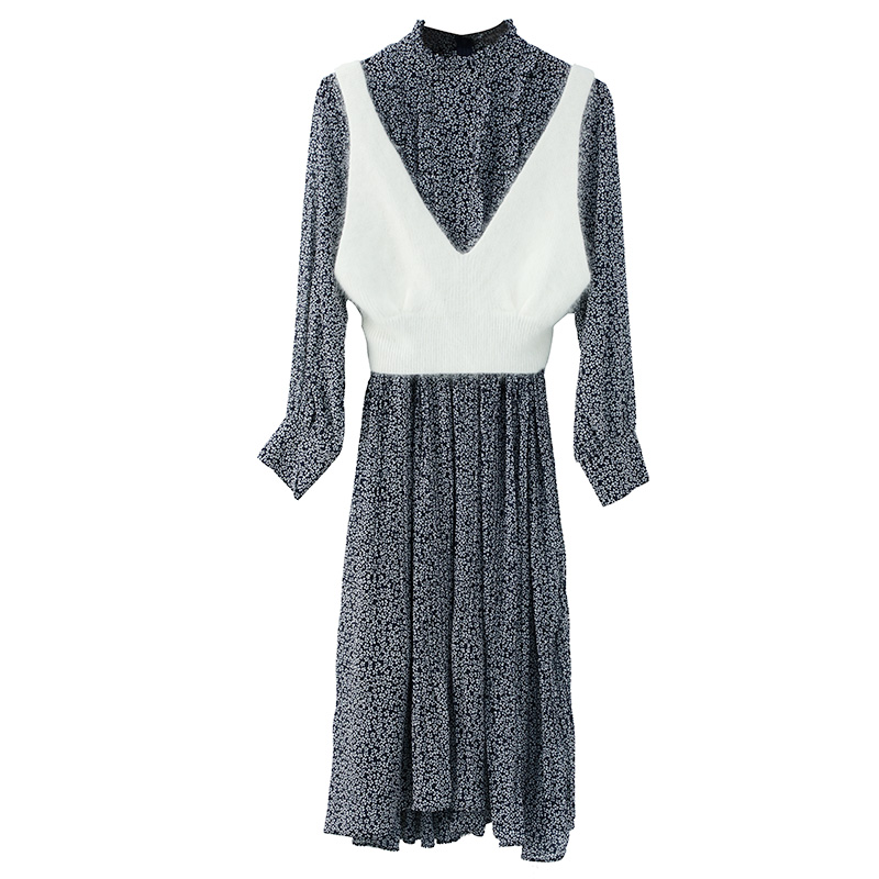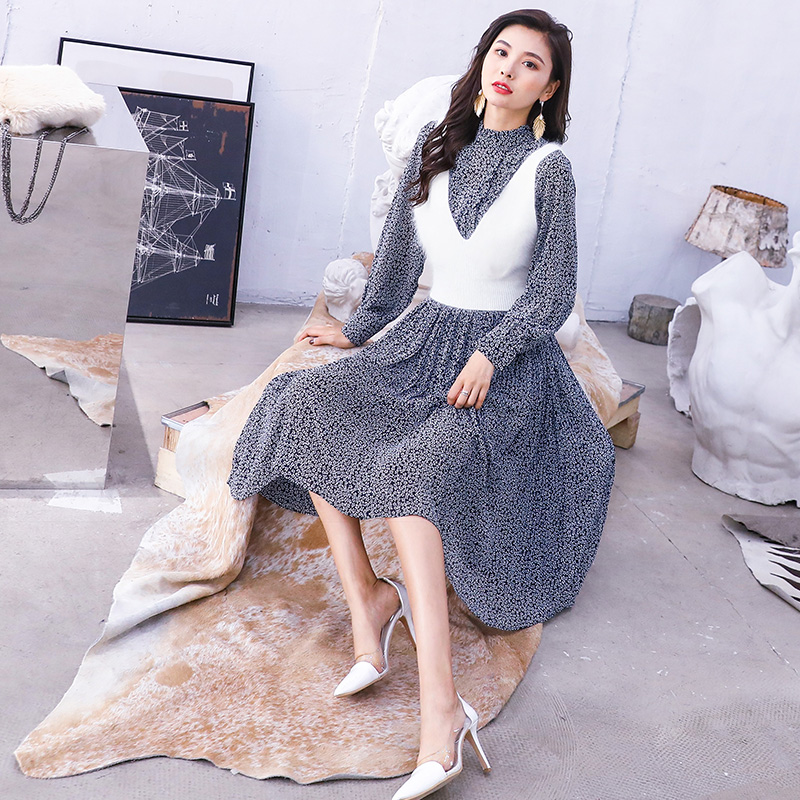 2018秋季新款韓版網紅印花連衣裙毛衣馬甲套裝女神范洋氣兩件套潮