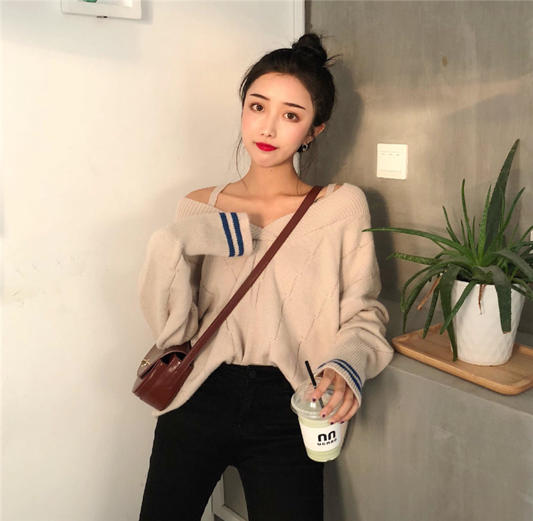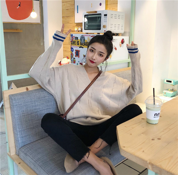 怕冷或是保守的MM可以把衣領翻上去就變成了基礎款V領毛衣