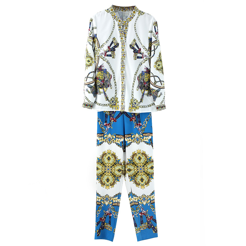 復古港味套裝女秋季2018新款時尚氣質印花襯衫九分小腳褲兩件套潮