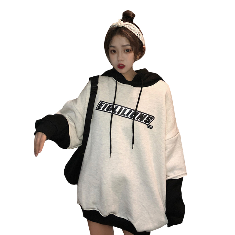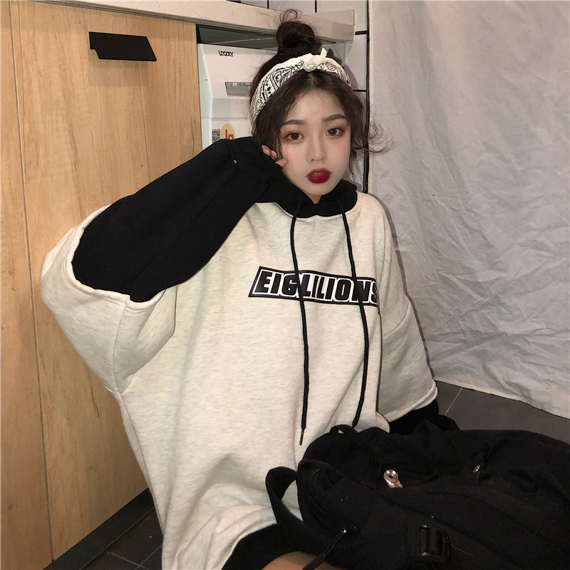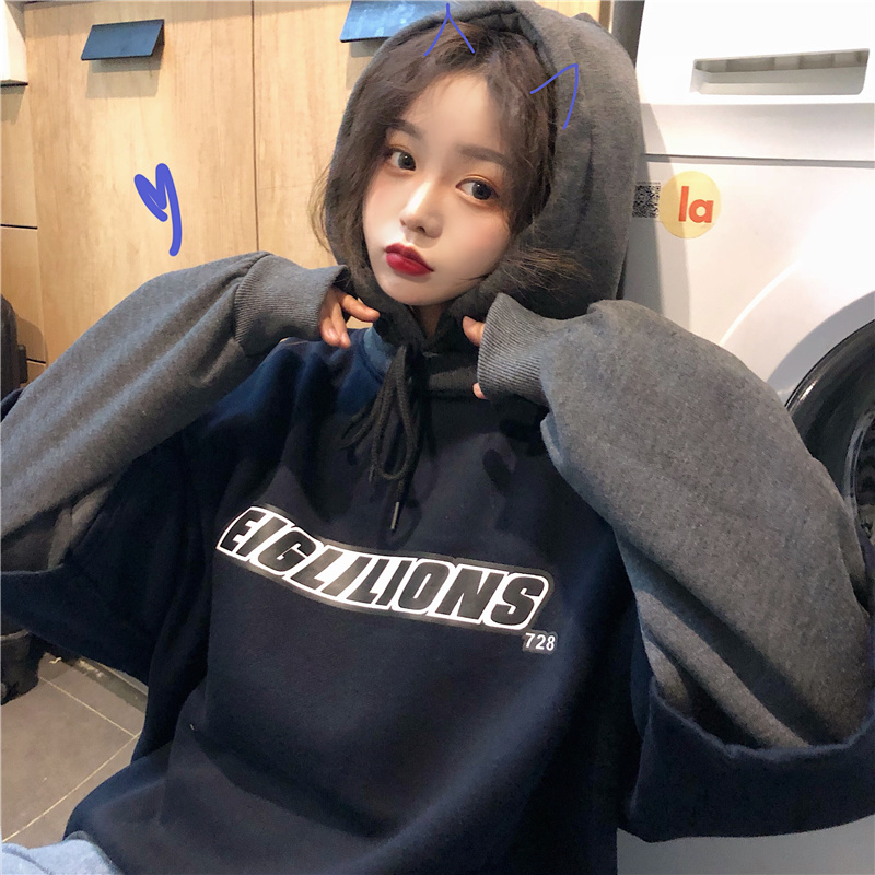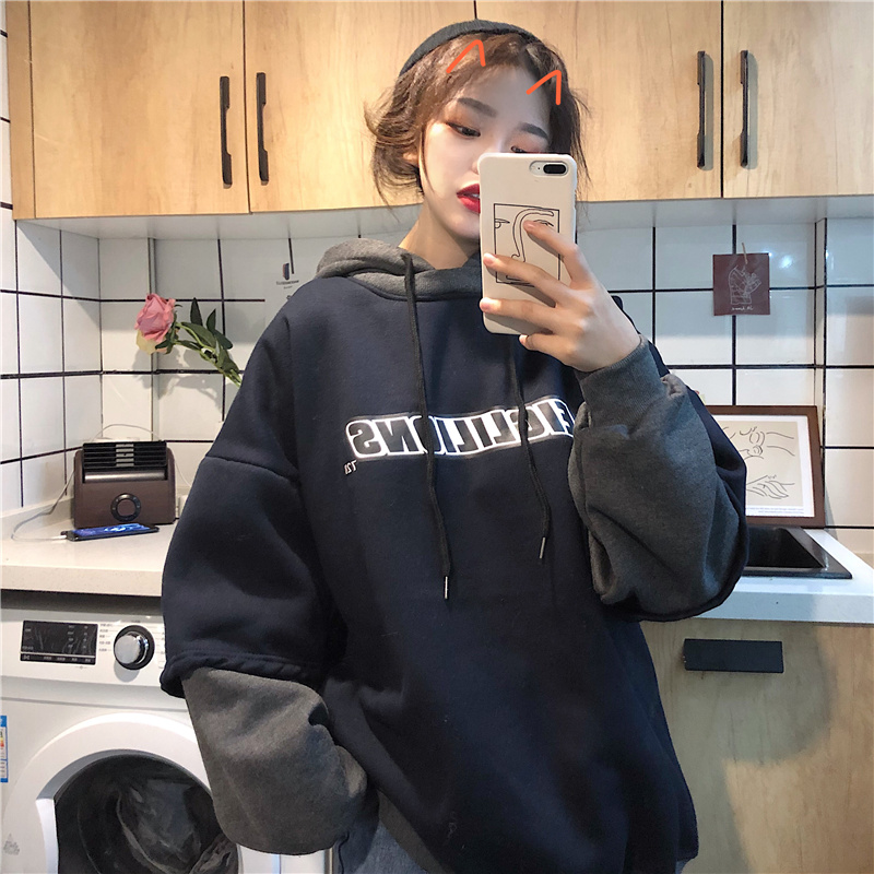 秋冬韓版原宿風拼色袖子字母寬松加絨加厚連帽套頭衛衣上衣外套女