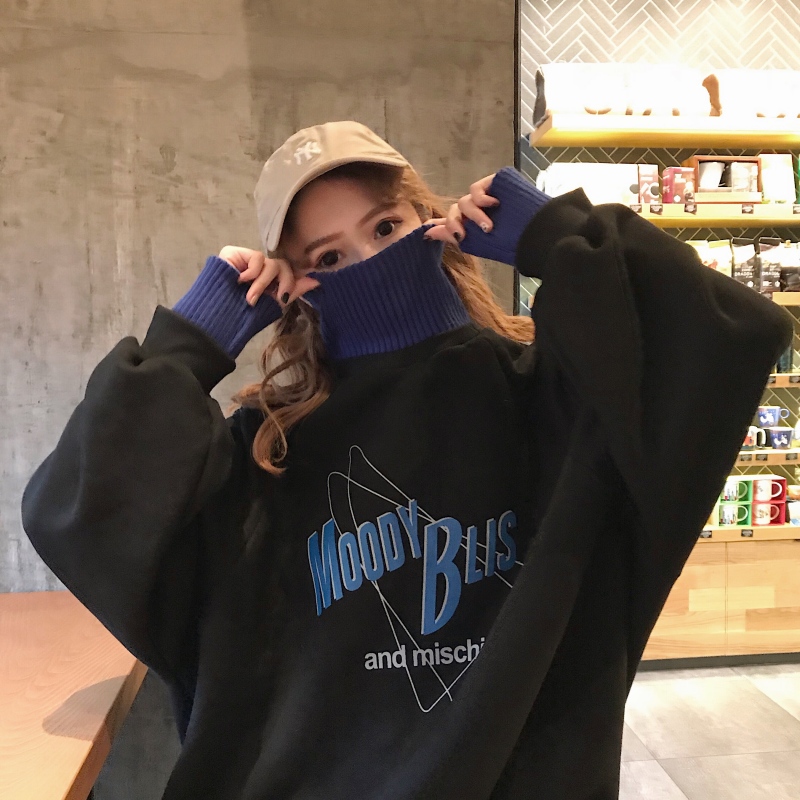 2018新款秋冬韓版原宿風寬松字母拼接高領加絨加厚超火衛衣外套女