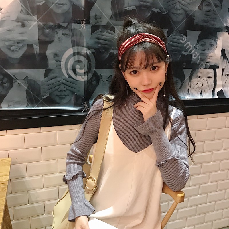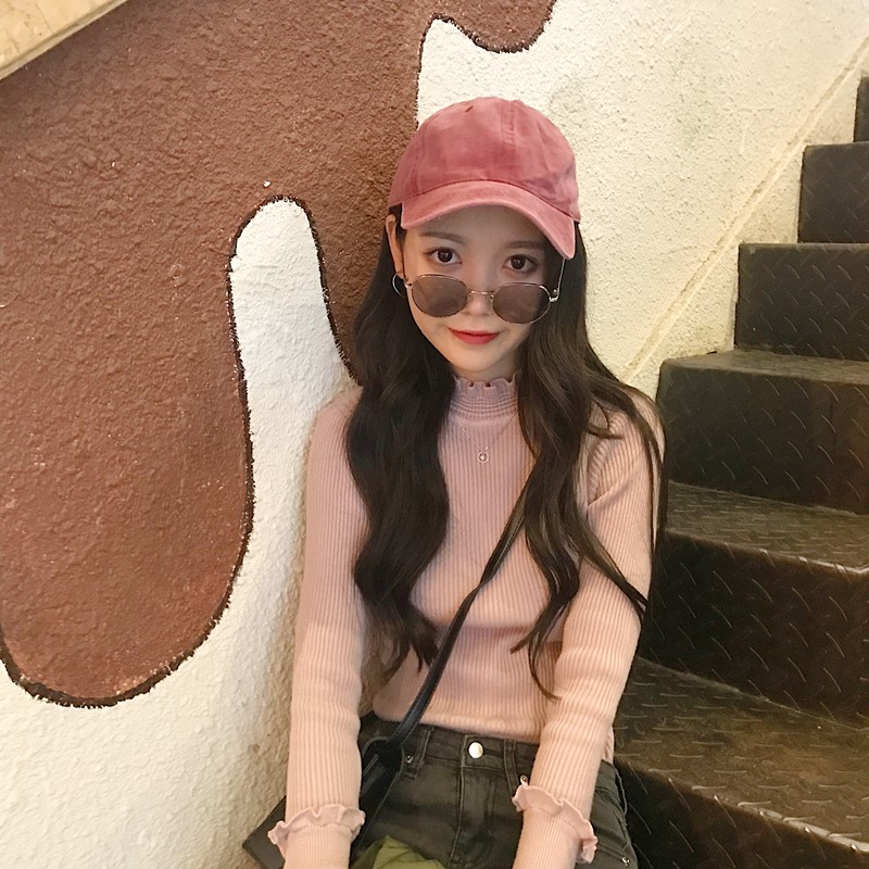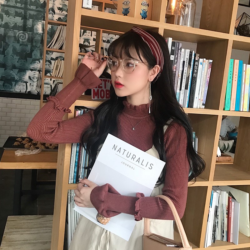 / 秋季韓版chic木耳邊半高領修身針織衫學生顯瘦長袖套頭毛衣上衣女