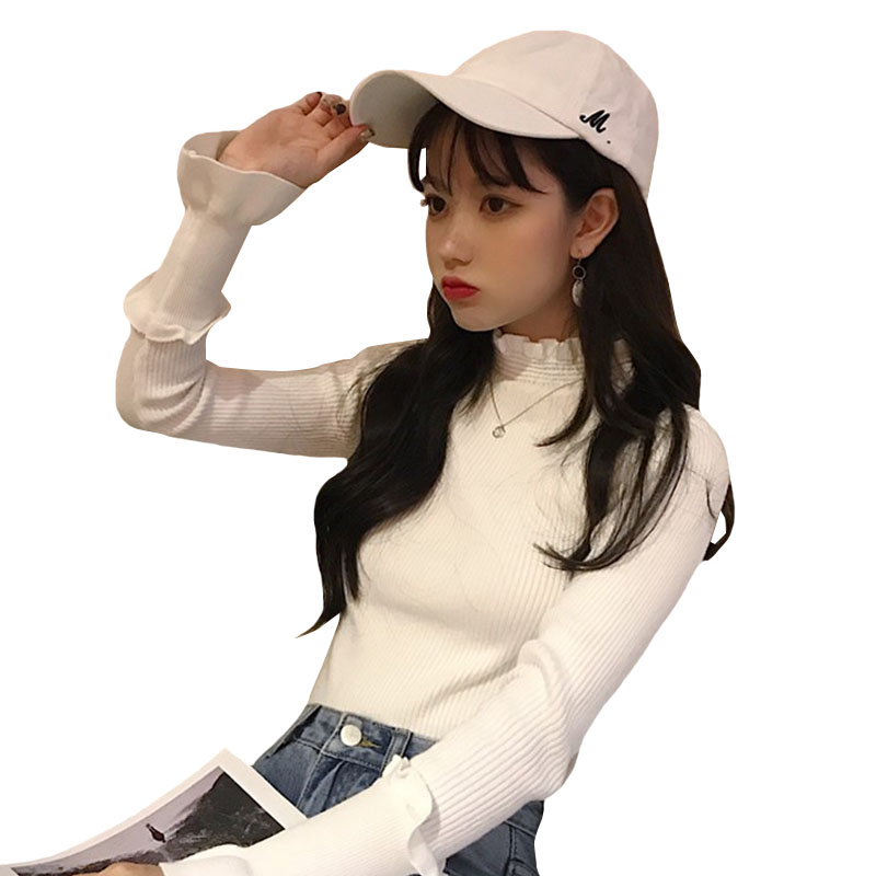 秋季韓版chic木耳邊半高領修身針織衫學生顯瘦長袖套頭毛衣上衣女