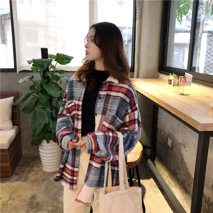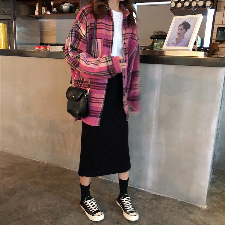 / 秋冬韓版chic中長款復古格子毛呢襯衫寬松休閑港風襯衣上衣外套女