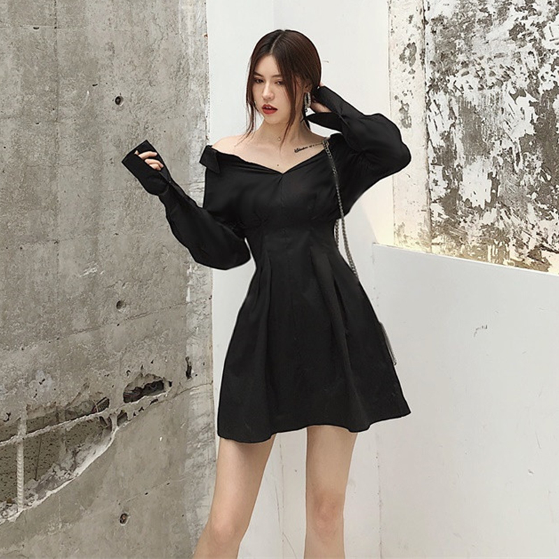 黑裙子女秋裝2018新款港味氣質收腰露肩襯衫裙修身長袖A字連衣裙