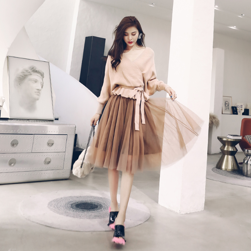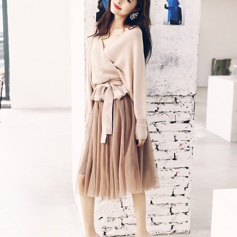 慵懶風連衣裙女兩件套2018秋新款網紗半身裙針織衫寬松毛衣套裝潮