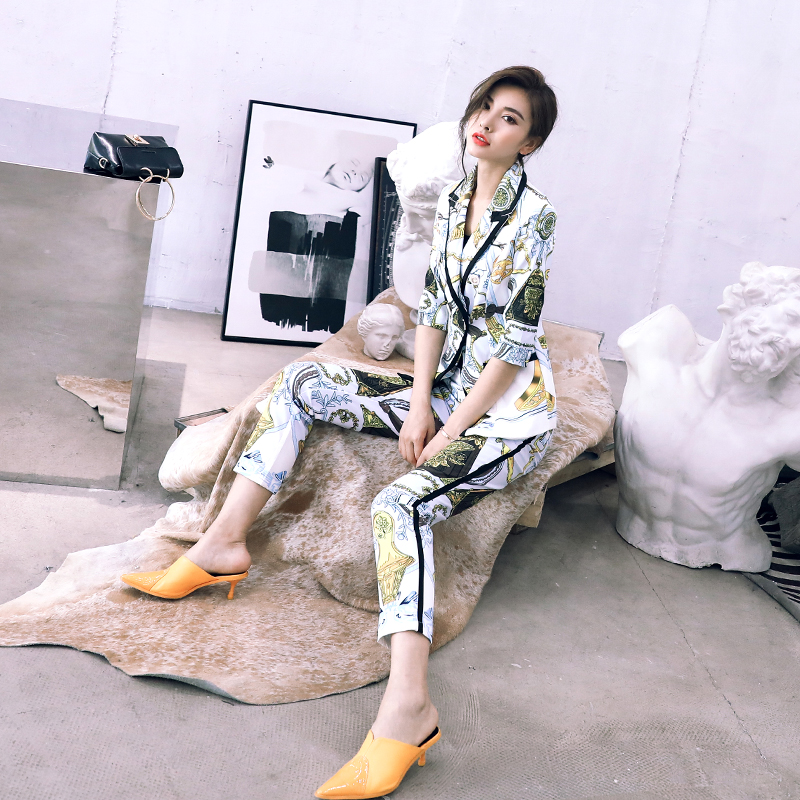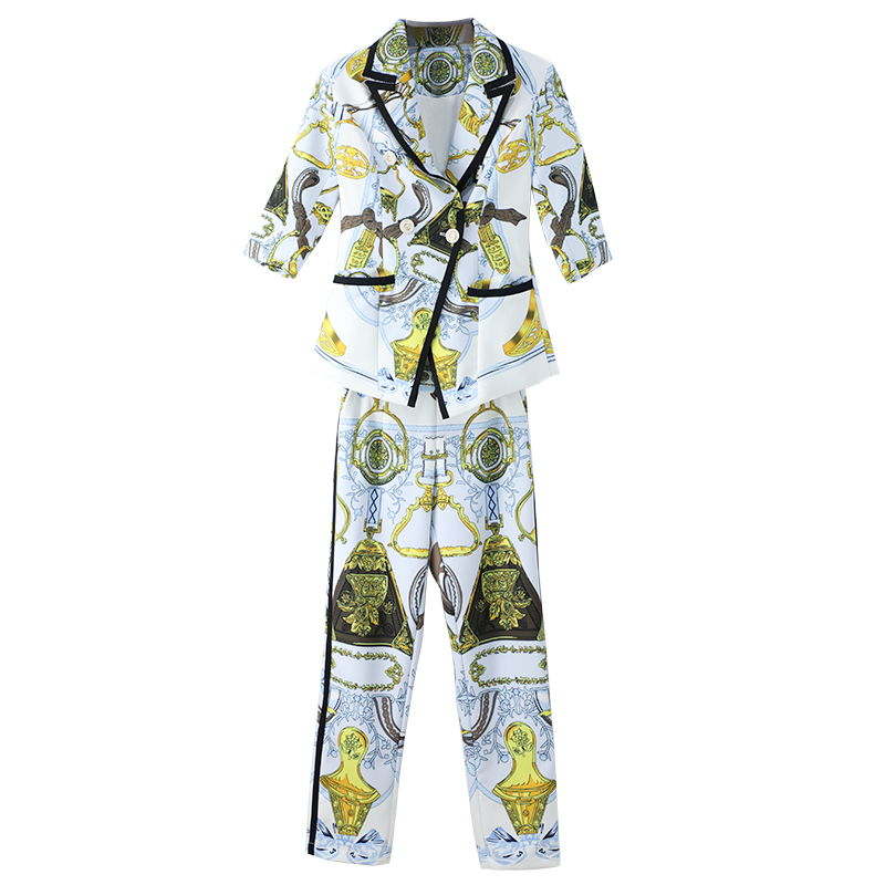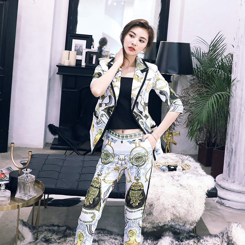 / 印花西裝套裝女秋裝2018新款時尚氣質顯瘦小腳褲復古港味兩件套夏