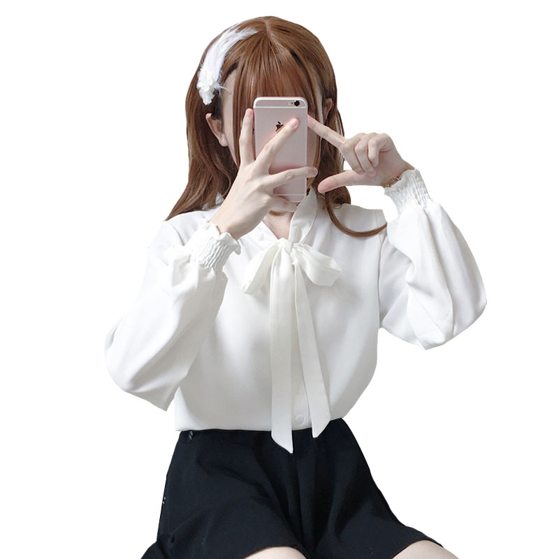 / 秋季女裝韓版氣質簡約純色蝴蝶結系帶襯衣寬松休閑長袖襯衫上衣潮