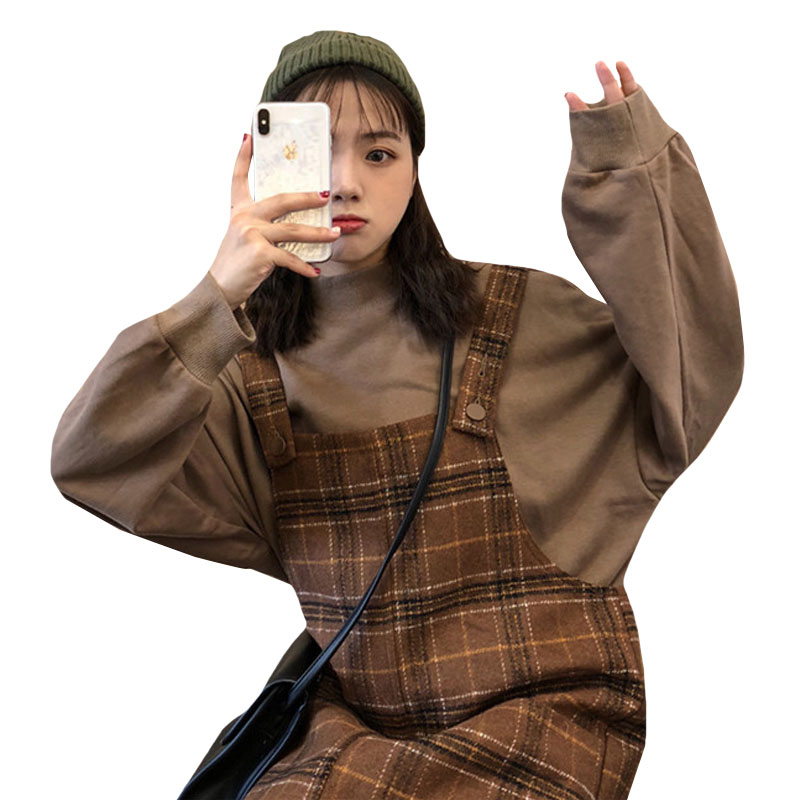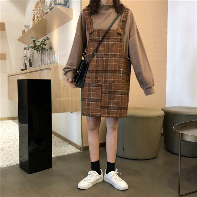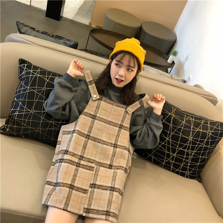 / 韓版時尚休閑套裝秋冬寬松高領衛衣+復古格子毛呢背帶裙兩件套女