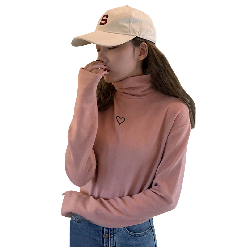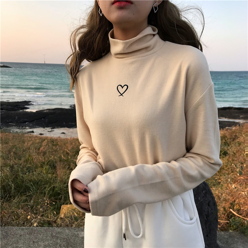 / 秋冬韓版修身顯瘦愛心刺繡磨毛保暖高領打底衫長袖T恤上衣學生女