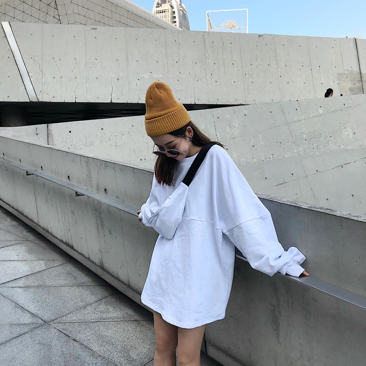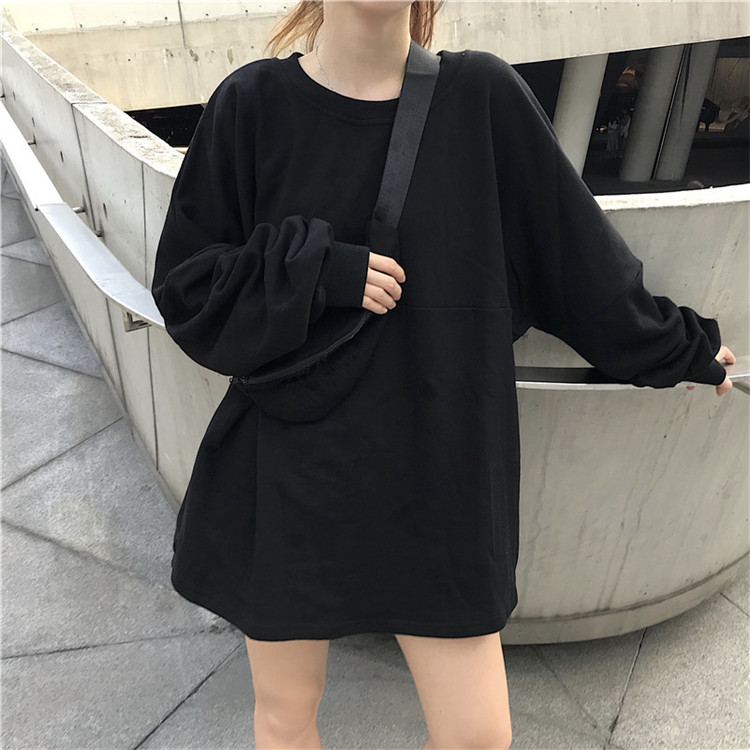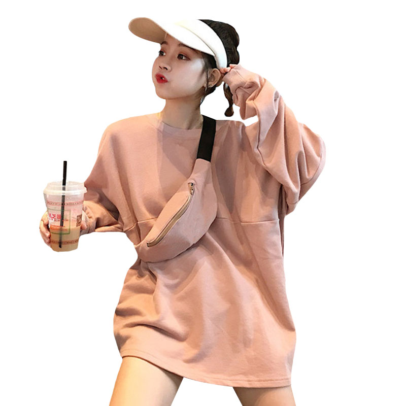 / 秋季女裝韓版中長款純色寬松圓領長袖休閑套頭衛衣上衣外套+腰包