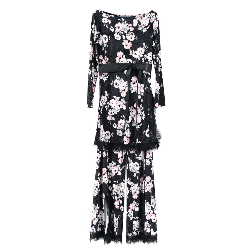 絲絨套裝女收腰上衣印花開叉蕾絲拼接長褲名媛氣質時尚初秋兩件套
