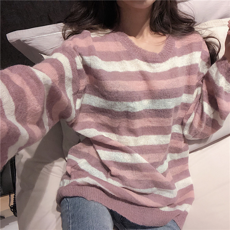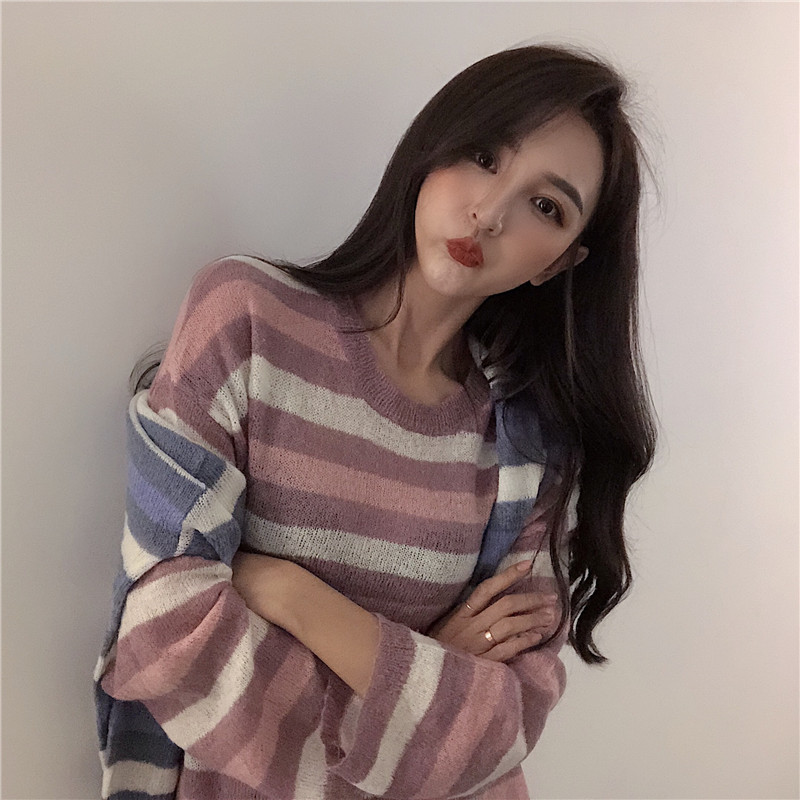 / 撞色條紋上衣女寬松顯瘦中長款百搭秋季chic基礎款薄款長袖針織衫