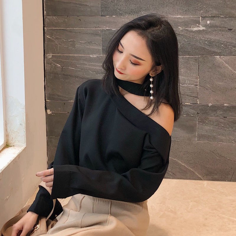 / 春裝新款女裝韓版復古掛脖斜肩長袖襯衫氣質寬松顯瘦露肩白襯衣女
