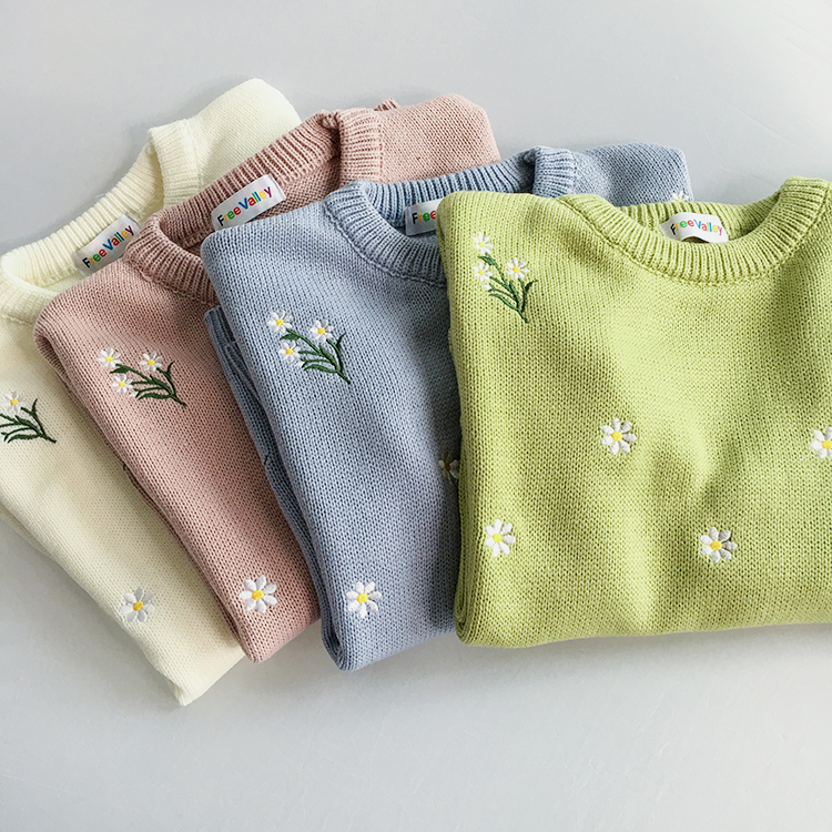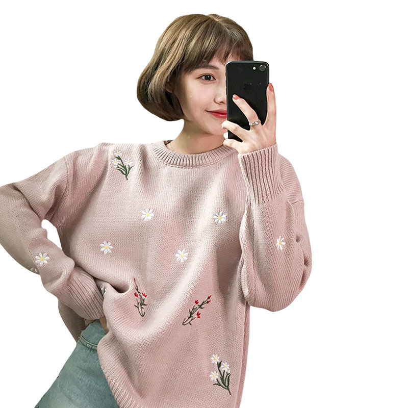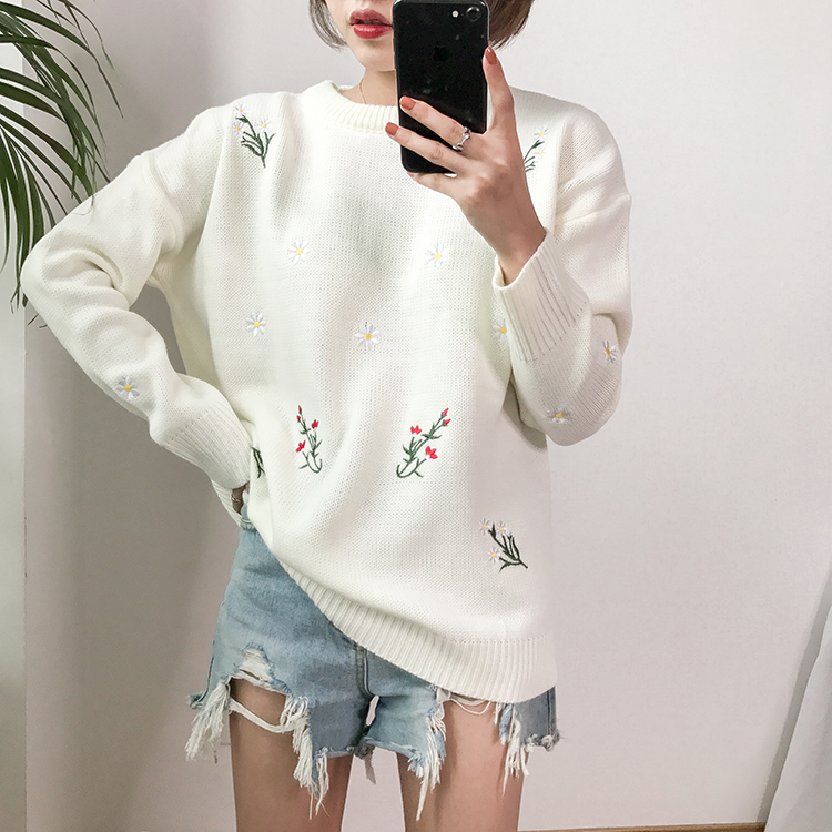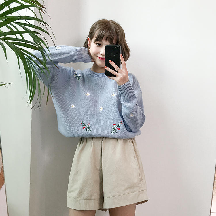 / 秋季韓版小清新刺繡小花慵懶風寬松套頭網紅長袖毛衣針織衫上衣女