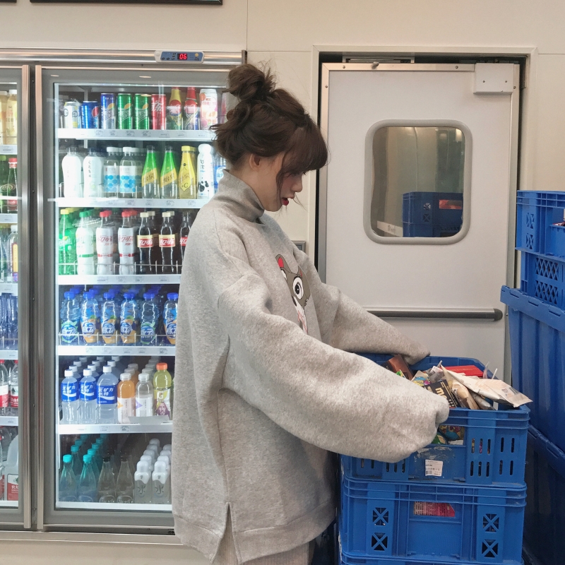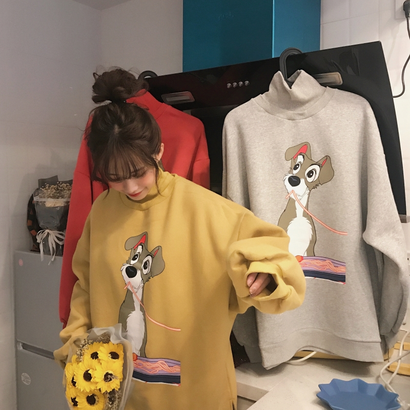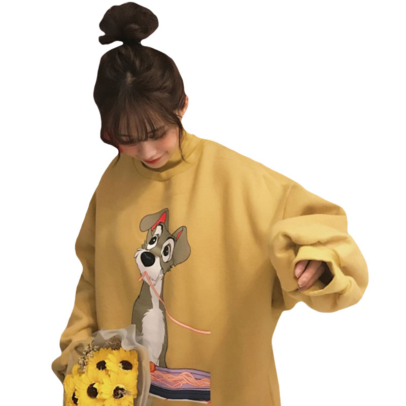 / 秋冬女裝韓版慵懶風寬松原宿風卡通加絨加厚高領套頭衛衣上衣外套