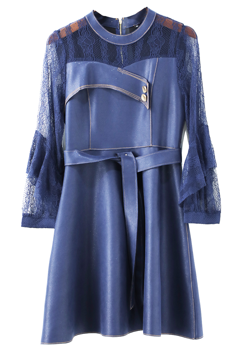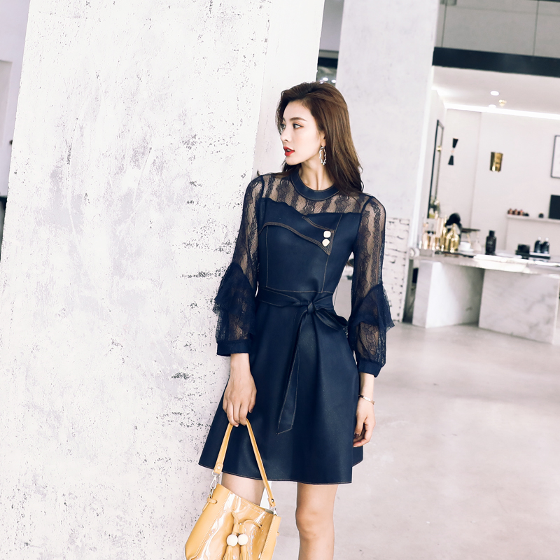 / 2018秋裝新款長袖小香中長款荷葉邊系帶鏤空拼接蕾絲淑女連衣裙
