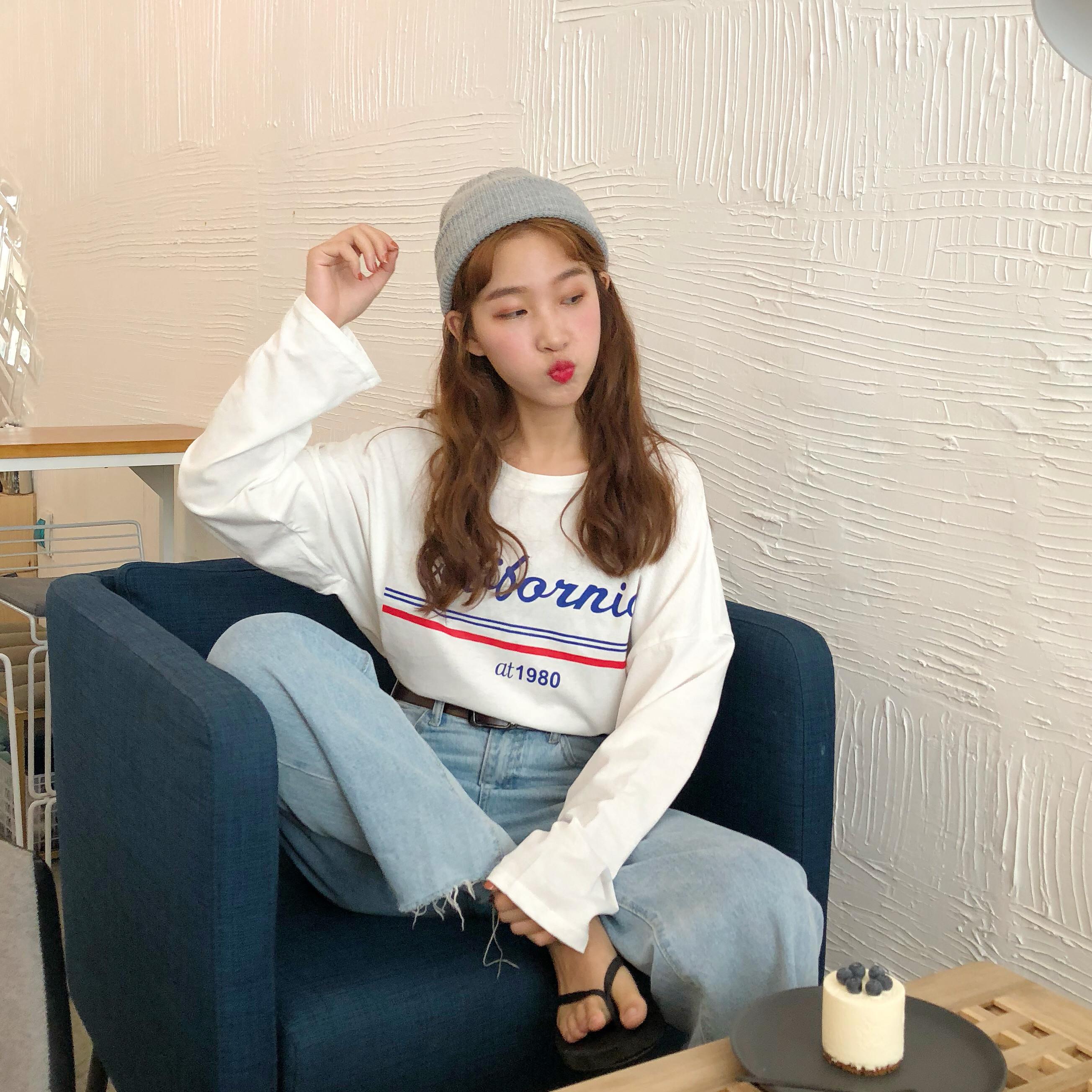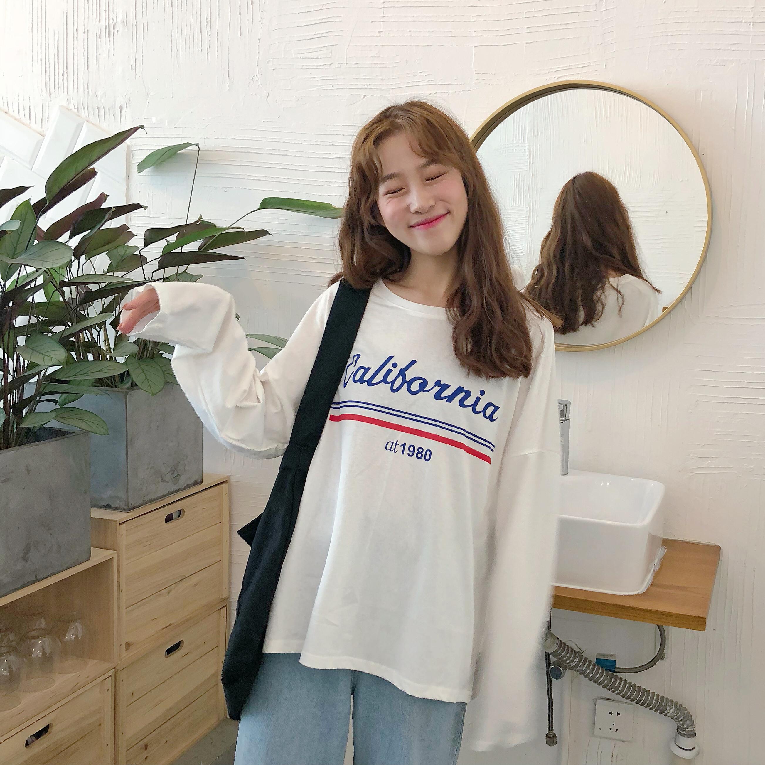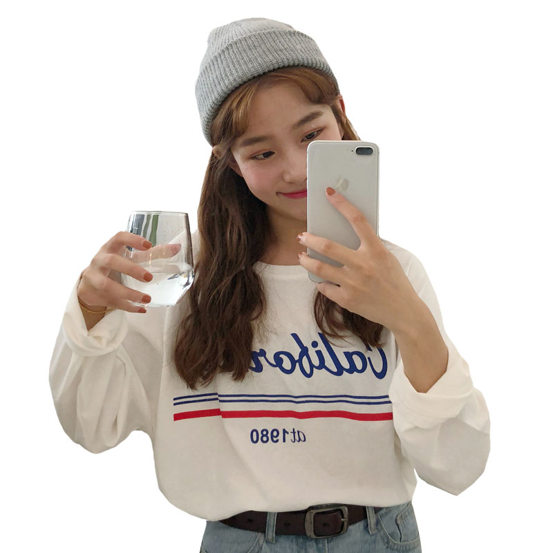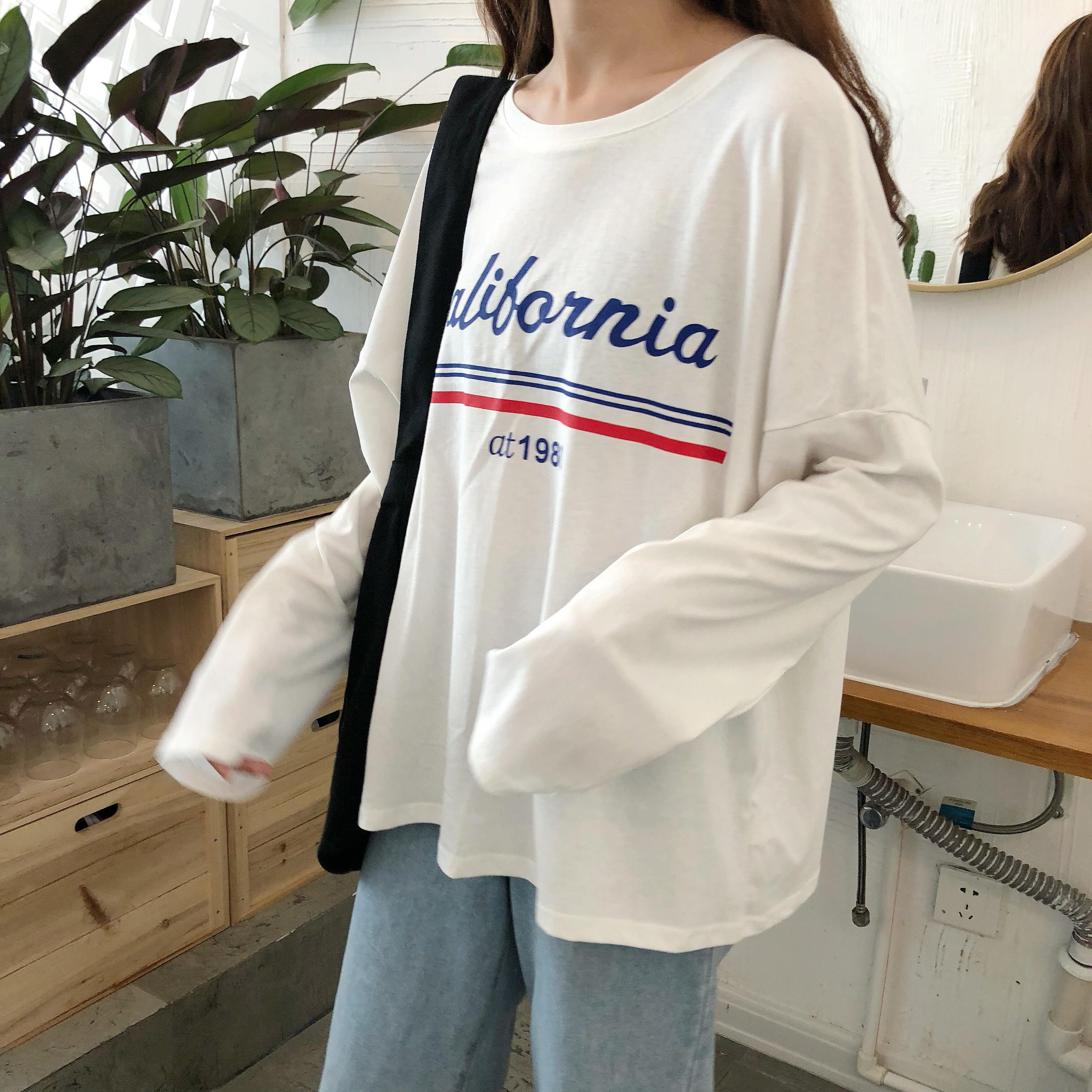 / 秋季女裝韓版寬松百搭顯瘦字母印花長袖T恤學生休閑圓領體恤上衣