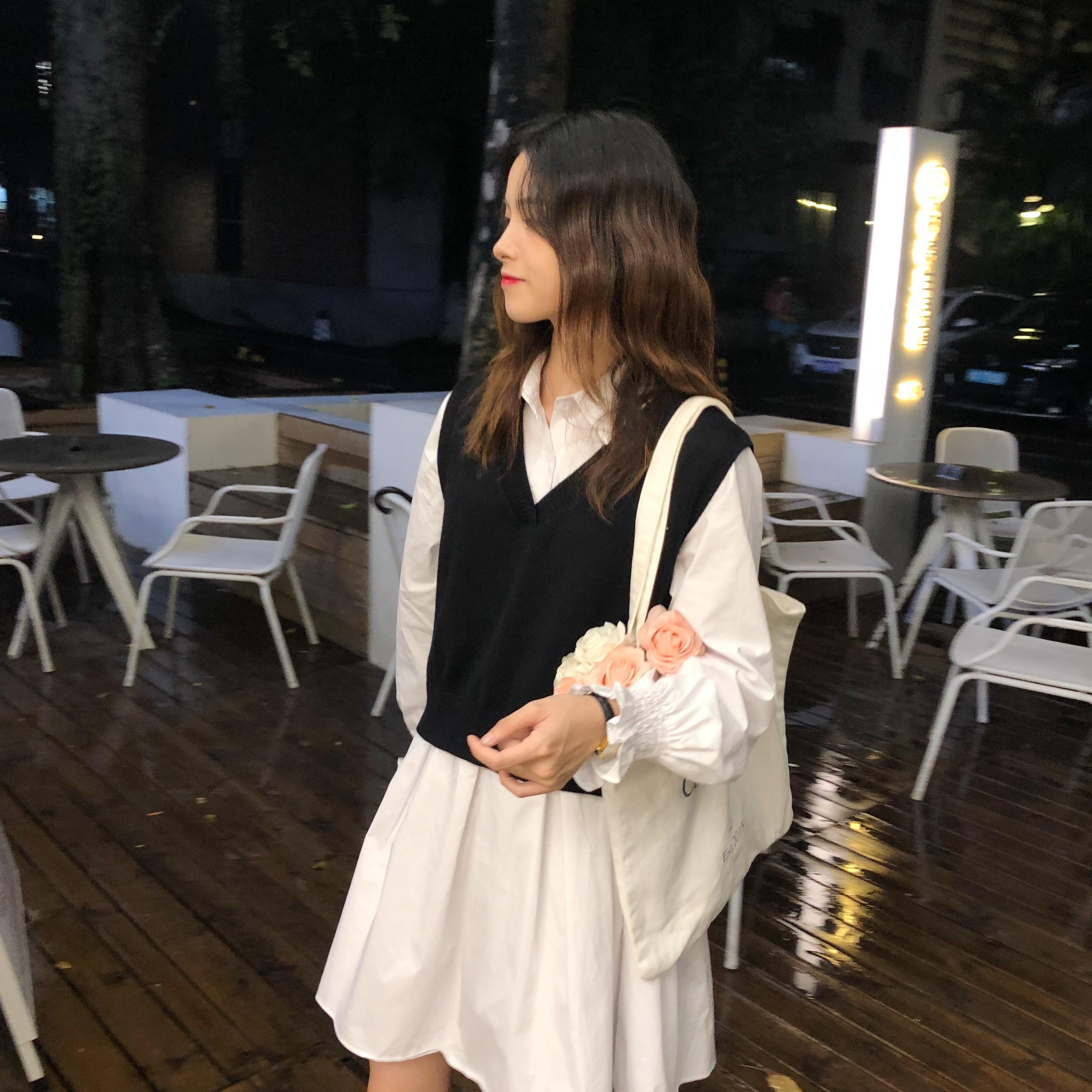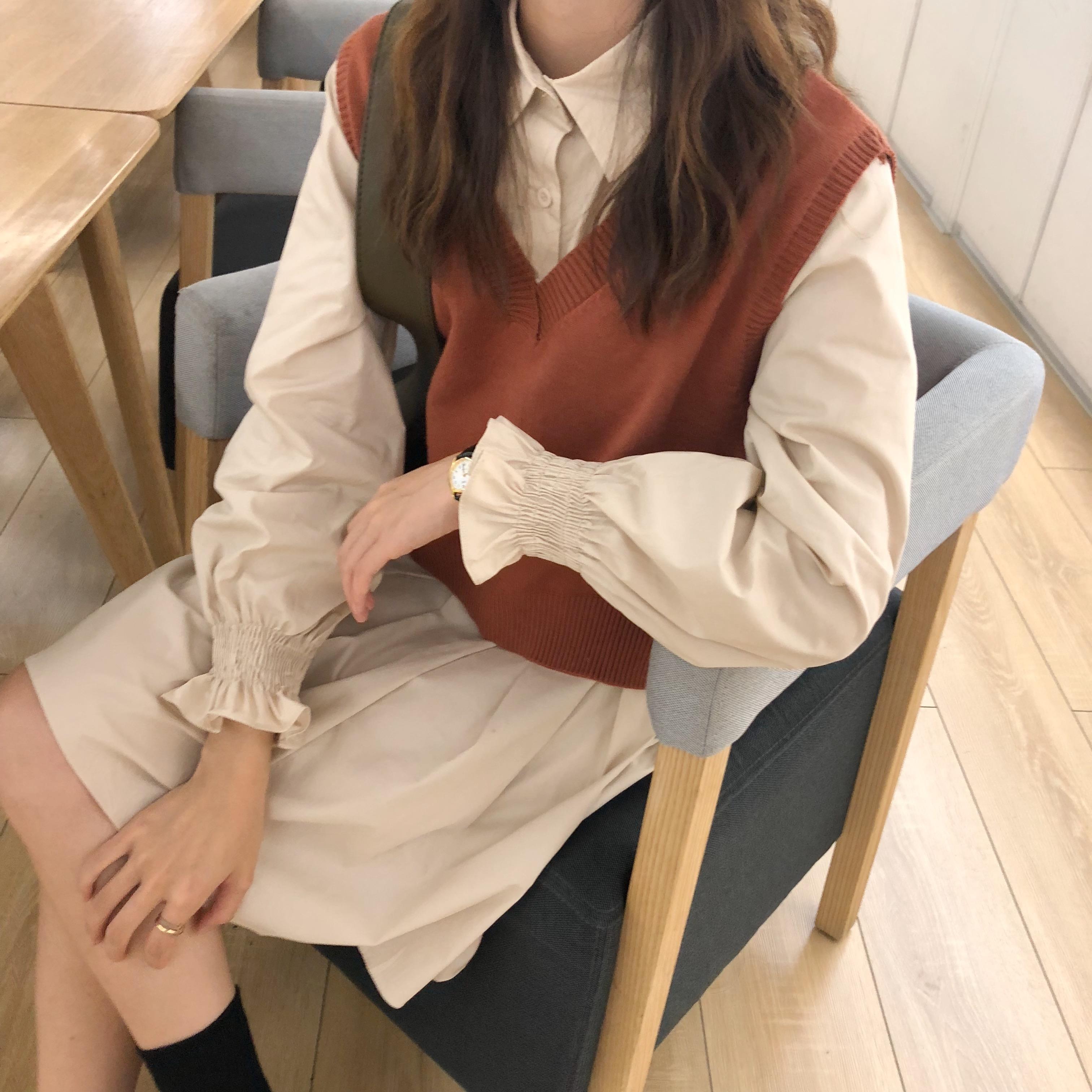/ 韓版時尚休閑套裝秋季氣質長袖襯衫連衣裙+針織背心馬甲兩件套女